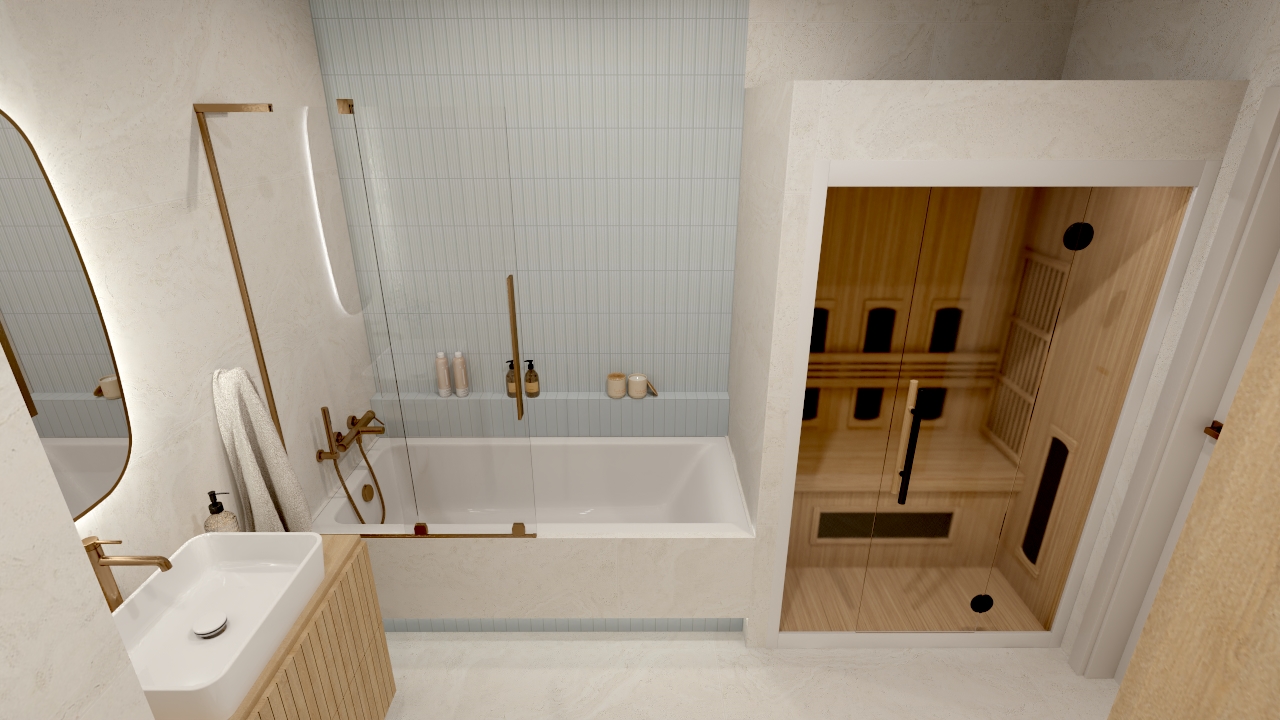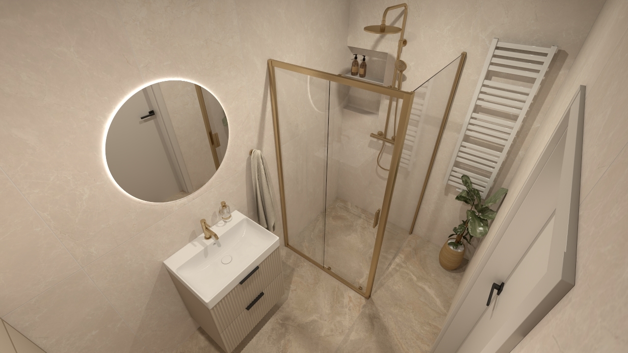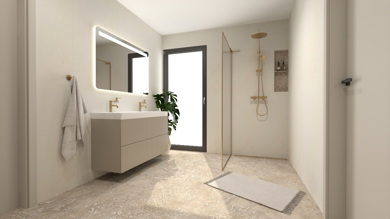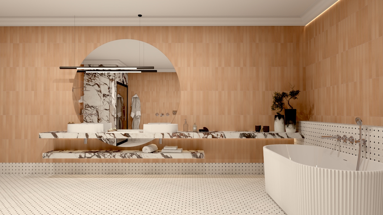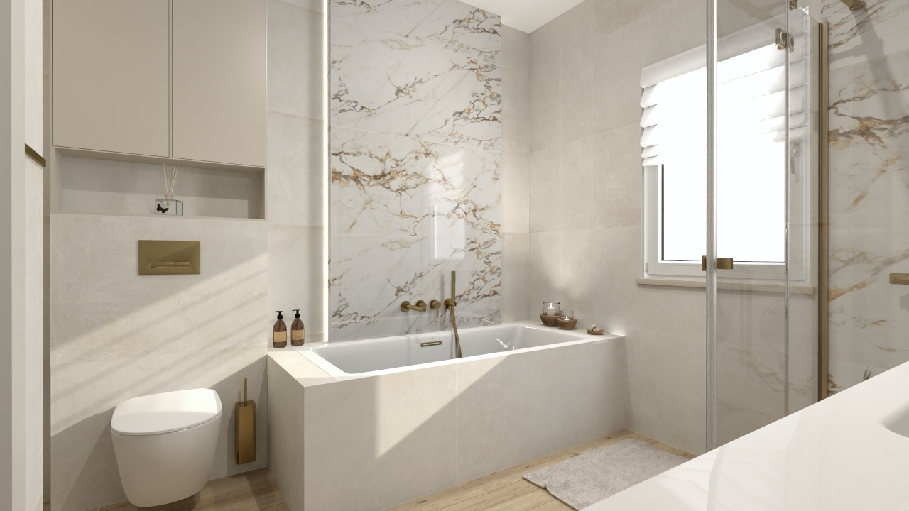 Salon kąpielowy z Pangea Sand i Deco Biscuit White