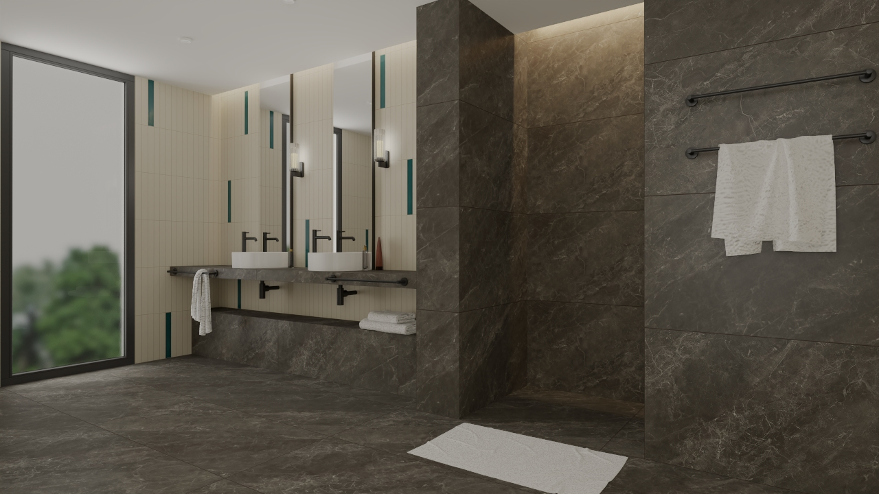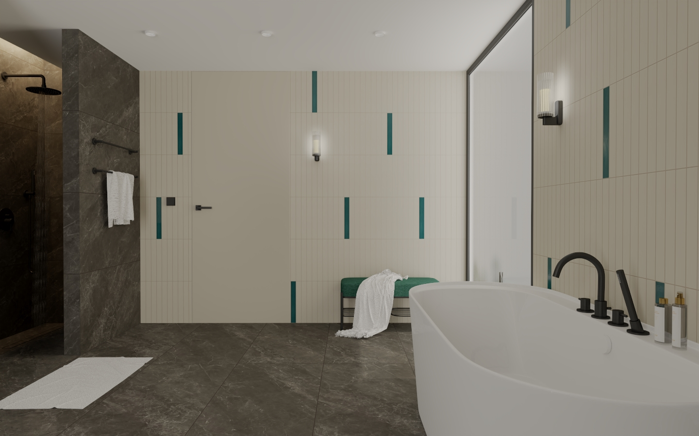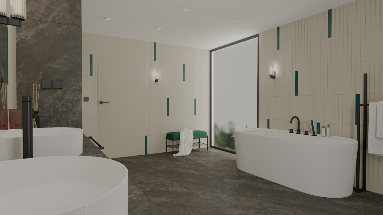 W tym projekcie postawiłam na wyrafinowaną grę kontrastów – surową elegancję kamienia zestawiłam z delikatnymi, pionowymi strukturami i akcentami kolorystycznymi, które dodają wnętrzu niepowtarzalnego charakteru. Baldocer Balmoral Dark Natural – ciemne, eleganckie płyty inspirowane naturalnym kamieniem stały się bazą dla całej aranżacji. Equipe Hopp Sand – jasne, piaskowe płytki o pionowej strukturze nadają przestrzeni lekkości. Dzięki nim wnętrze nie jest przytłaczające, a rytmiczne linie optycznie podwyższają ściany. Vitral Petrol Reactive – głębokie, petrolowe akcenty pojawiające się nieregularnie na ścianach to element, który dodaje dynamiki. To nawiązanie do artystycznego ducha przestrzeni – delikatny, ale wyrazisty detal, który przyciąga wzrok.