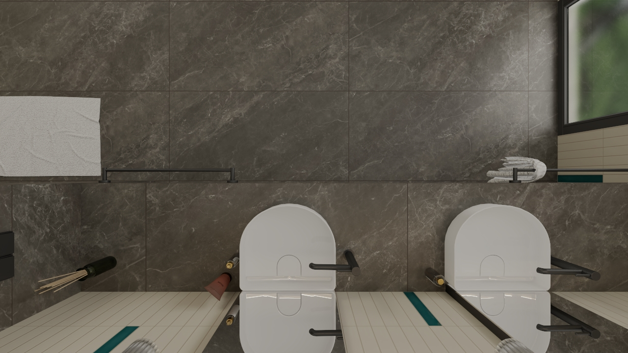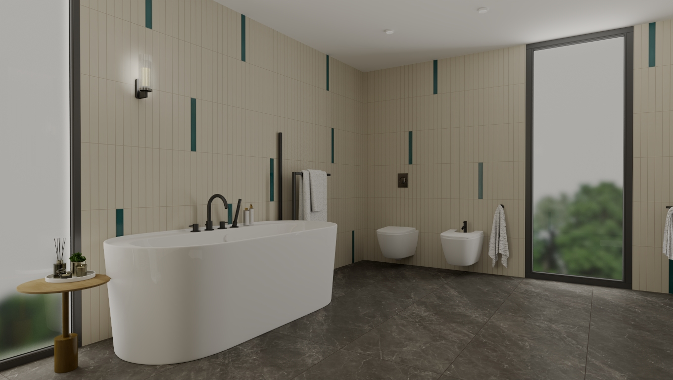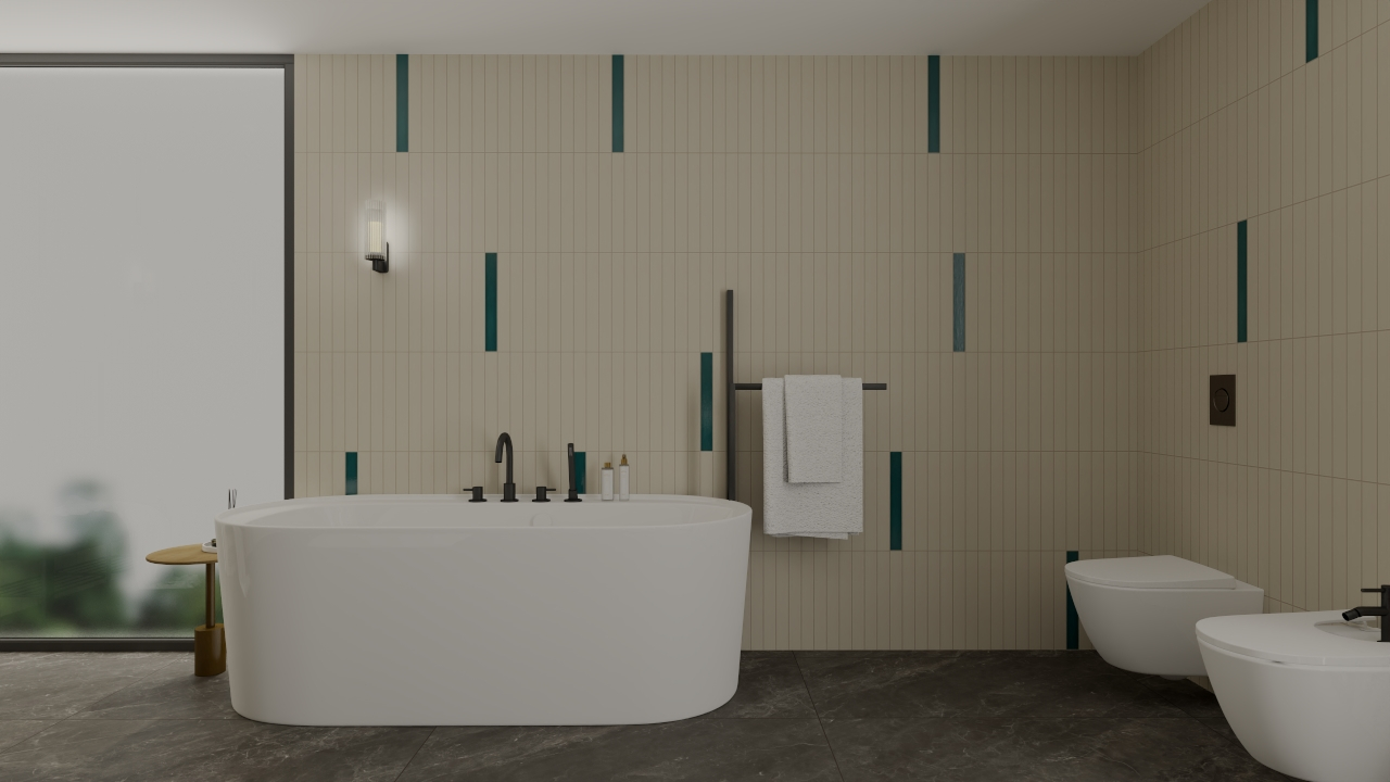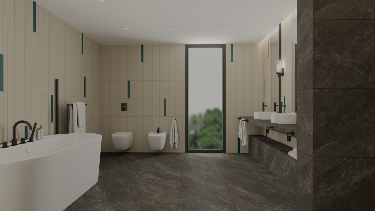W tym projekcie postawiłam na wyrafinowaną grę kontrastów – surową elegancję kamienia zestawiłam z delikatnymi, pionowymi strukturami i akcentami kolorystycznymi, które dodają wnętrzu niepowtarzalnego charakteru. Baldocer Balmoral Dark Natural – ciemne, eleganckie płyty inspirowane naturalnym kamieniem stały się bazą dla całej aranżacji. Equipe Hopp Sand – jasne, piaskowe płytki o pionowej strukturze nadają przestrzeni lekkości. Dzięki nim wnętrze nie jest przytłaczające, a rytmiczne linie optycznie podwyższają ściany. Vitral Petrol Reactive – głębokie, petrolowe akcenty pojawiające się nieregularnie na ścianach to element, który dodaje dynamiki. To nawiązanie do artystycznego ducha przestrzeni – delikatny, ale wyrazisty detal, który przyciąga wzrok.