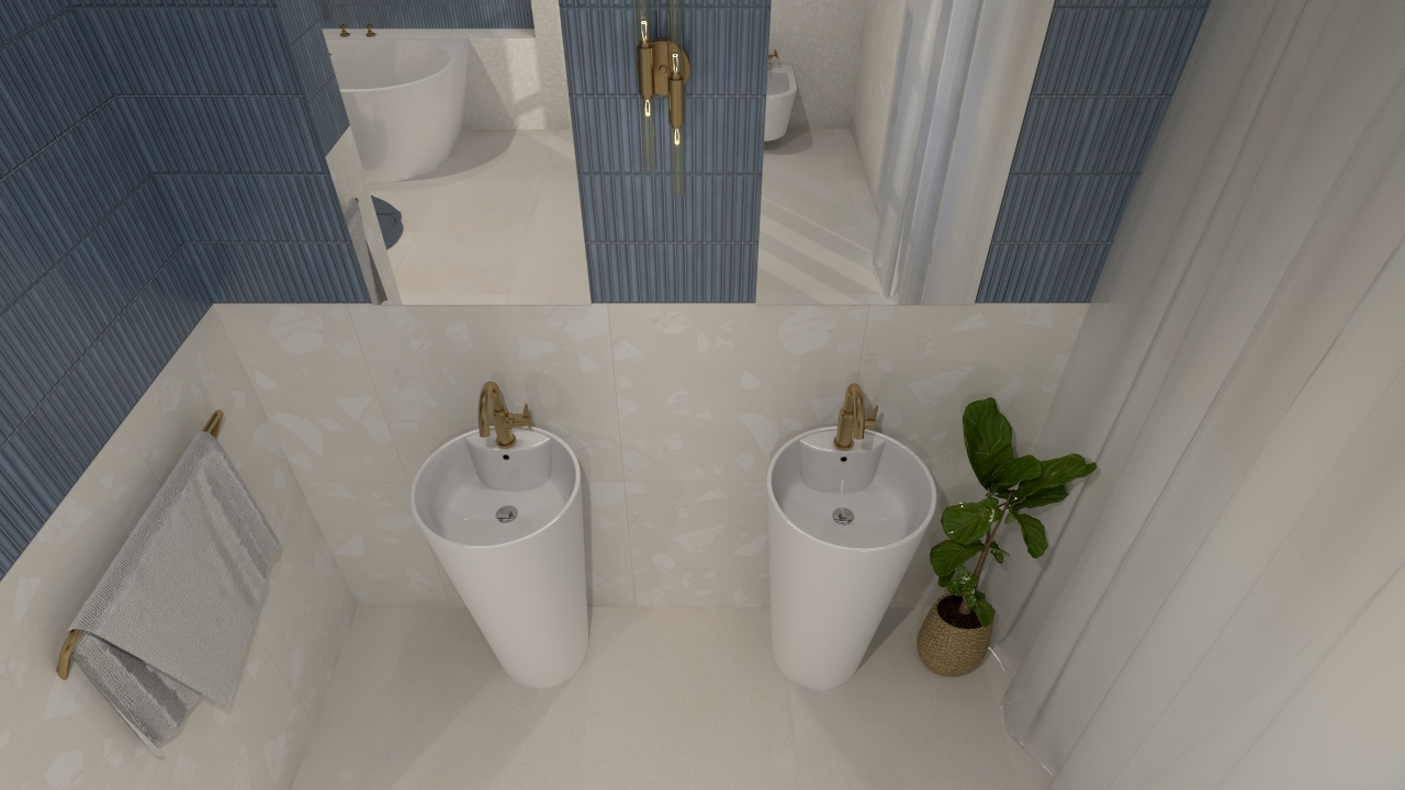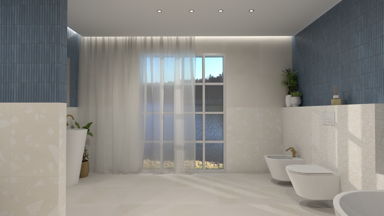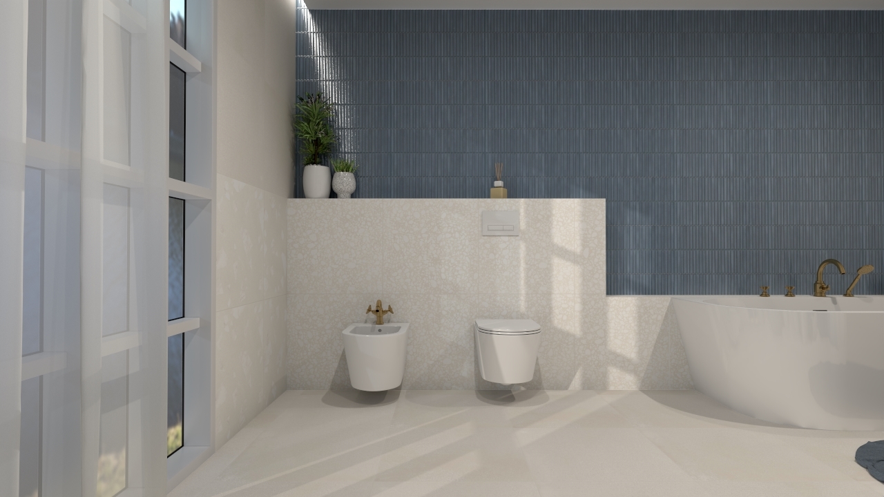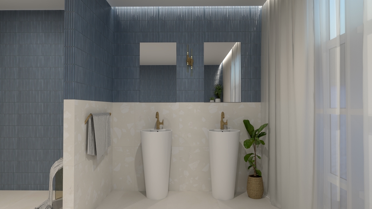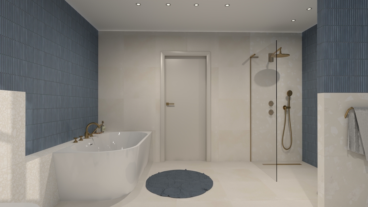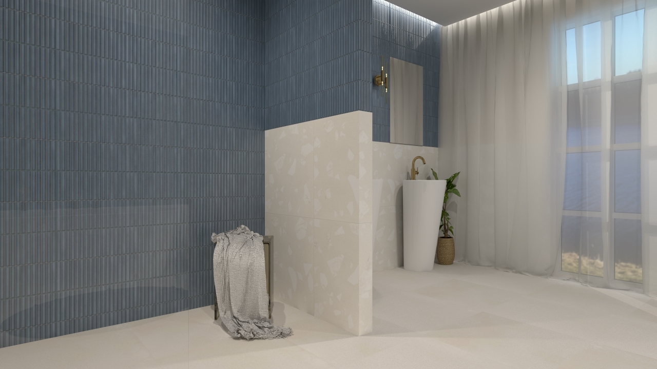 Subtelność kamienia z głębią morskiego błękitu, czyli Medley White oraz Deco Lingot Blue. Bazą projektu są płytki z kolekcji Medley od Włoskiego producenta Egron, które subtelnie różnicują przestrzeń poprzez zmienność wzoru i faktury. Zastosowano tu trzy warianty: