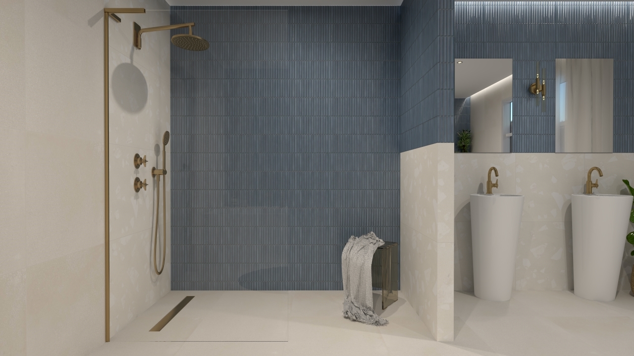 Na wybranych fragmentach ścian zastosowano błyszczącą, ryflowaną płytkę Deco Lingot Blue, która przyciąga wzrok swoim intensywnym, głębokim odcieniem niebieskiego. Jej pionowy, liniowy deseń nadaje ścianom eleganckiego, nowoczesnego charakteru.