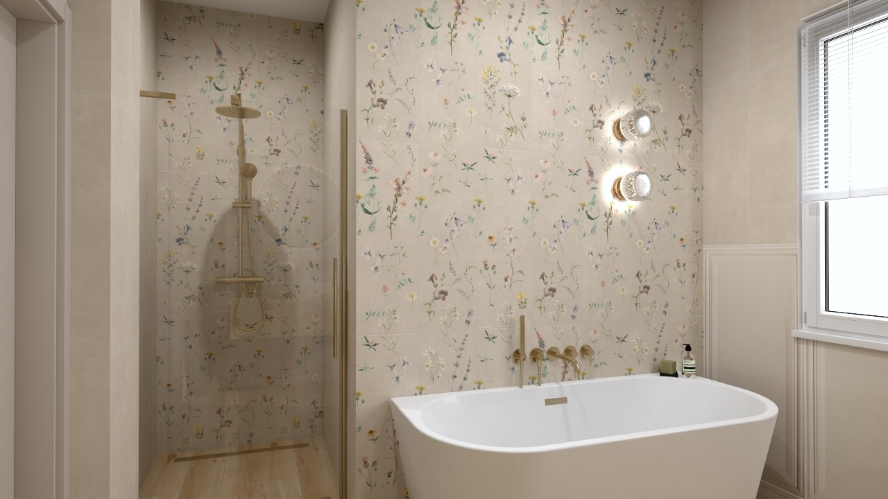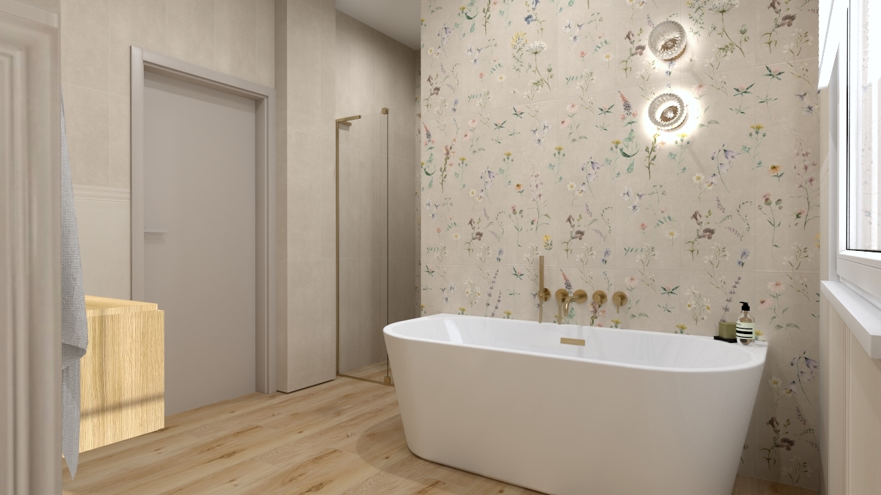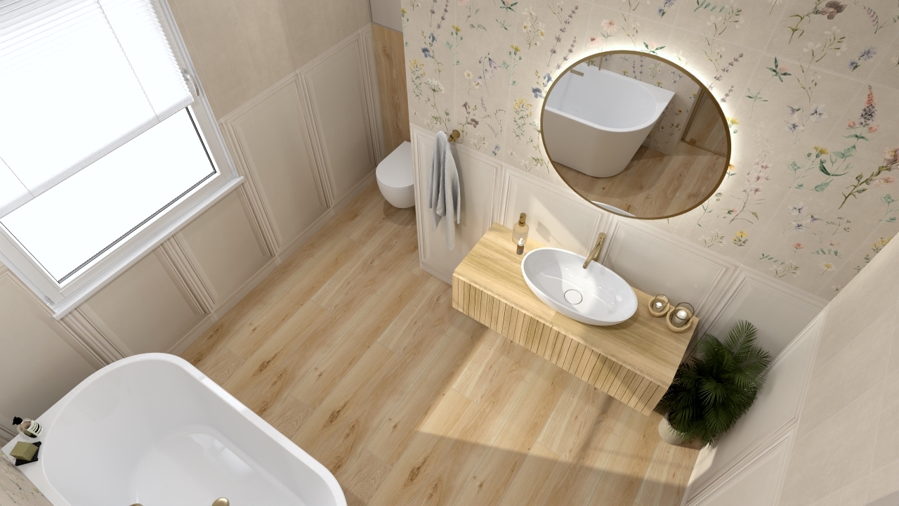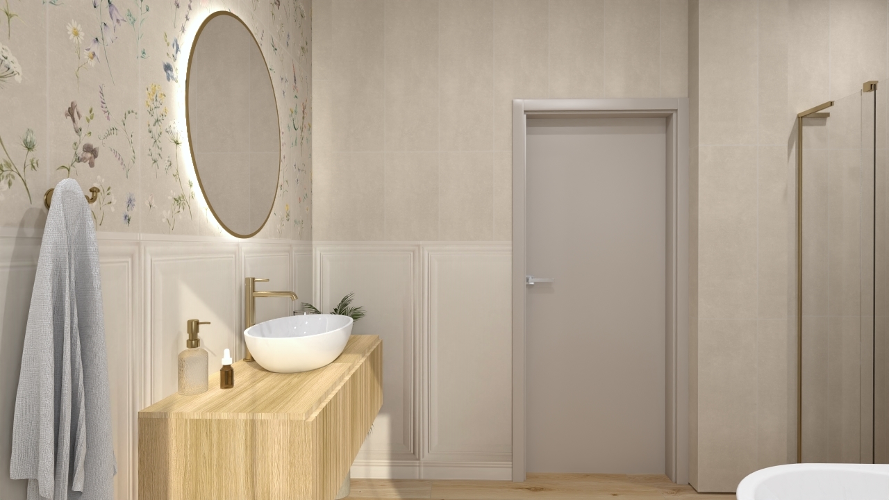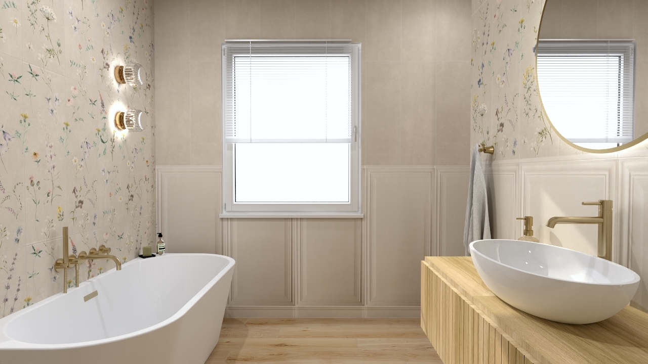 Naturalna harmonia, czyli Bellagio Sorico Mandorla, Raw Polan oraz Oregon Nogal. Aranżacja tej łazienki to przestrzeń, w której klasyczne rozwiązania spotykają się z delikatnym, romantycznym wzornictwem inspirowanym naturą. Dolne partie ścian zostały wykończone płytką Bellagio Sorico Mandorla, która wiernie naśladuje wygląd klasycznej boazerii. Jej subtelny, beżowy odcień idealnie komponuje się z resztą, wprowadzając do wnętrza spokój i przyjemne ciepło. Na wyższych partiach ścian zastosowano płytki z kolekcji Raw Naive. Ich bazowa wersja utrzymana jest w jasnym, naturalnym beżu, o strukturze przypominającej miękką tkaninę. Subtelna, tekstylna powierzchnia nadaje wnętrzu lekkości i delikatności. Prawdziwą ozdobą jest jednak dekor Raw Polan Mix Naive – płytka z kwiatowymi motywami w pastelowych odcieniach. Ręcznie malowane wrażenie wzoru, pełnego drobnych polnych roślin, tworzy efekt jak z romantycznej akwareli. Podłogę pokrywa płytka drewnopodobna Oregon Nogal, wprowadzająca naturalne ciepło i przytulność. Jej orzechowa tonacja oraz wyraziste usłojenie doskonale równoważą jasne barwy ścian, nadając całości wyważonego charakteru.