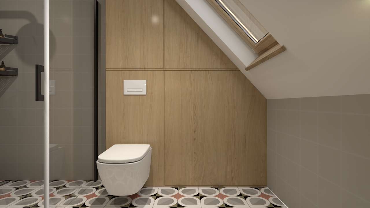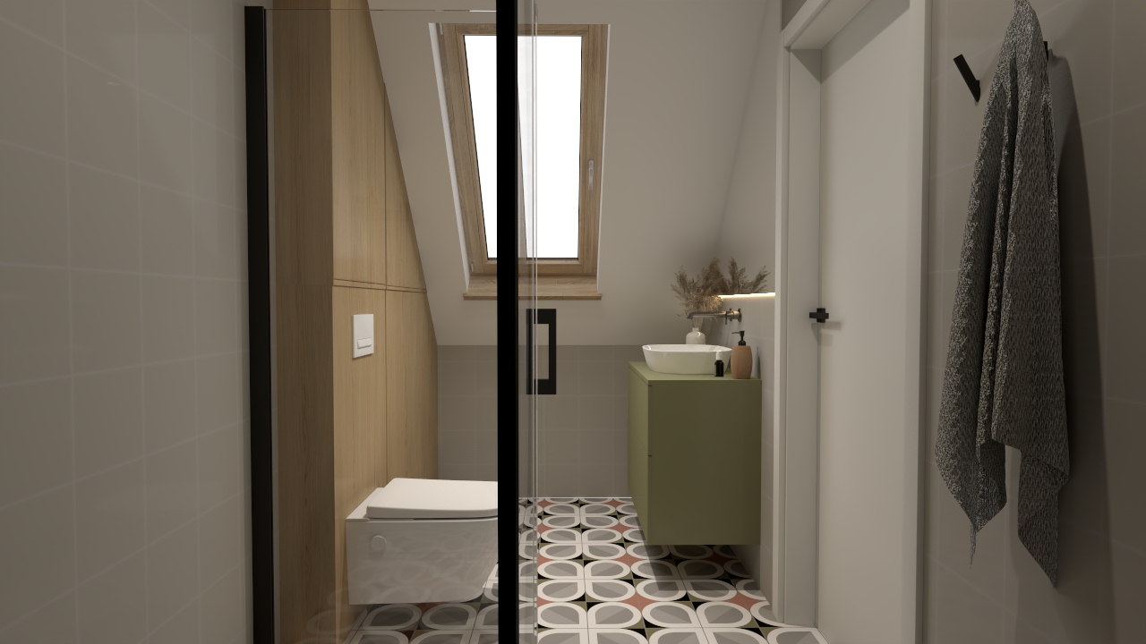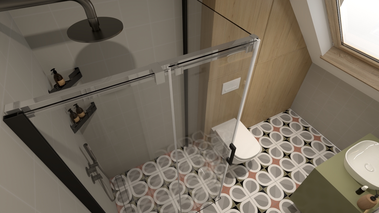 Na posadzce zastosowano dekoracyjne płytki Bauhome Blatt Cold w formacie 20×20 cm. Ich wzór bazuje na powtarzalnym motywie geometrycznych liści, ułożonych w rytmiczną, graficzną kompozycję. Kolory – czerń, biel i akcenty terakotowej czerwieni – tworzą efektowne zestawienie, które wnosi do wnętrza energię i wyraźnie definiuje jego charakter. Dla zrównoważenia dekoracyjnej posadzki na ścianach zastosowano płytki Bauhome Grau, również w formacie 20×20 cm. Ich subtelna szarość i gładka, matowa powierzchnia pełnią rolę tła, które uspokaja całą kompozycję i sprawia, że geometryczny wzór na podłodze nie przytłacza wnętrza. To właśnie kontrast pomiędzy neutralnością ścian a wyrazistym charakterem posadzki nadaje łazience balans i elegancję.