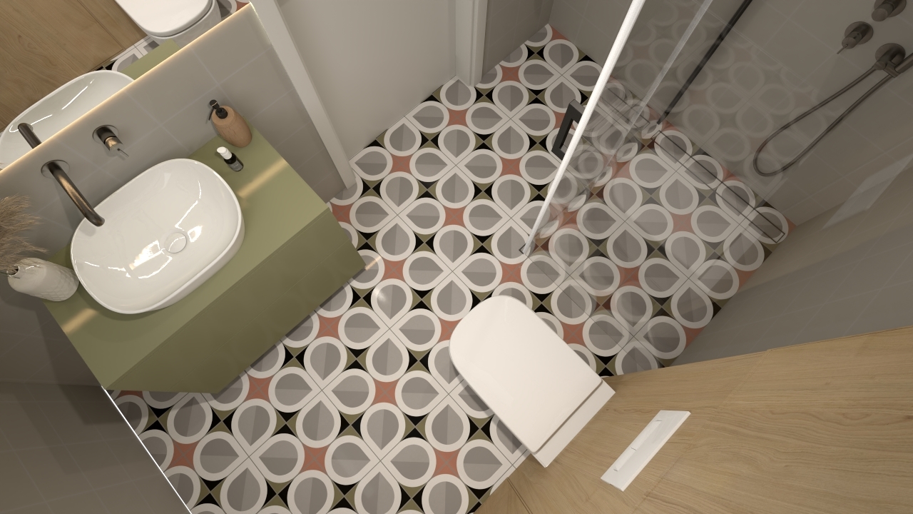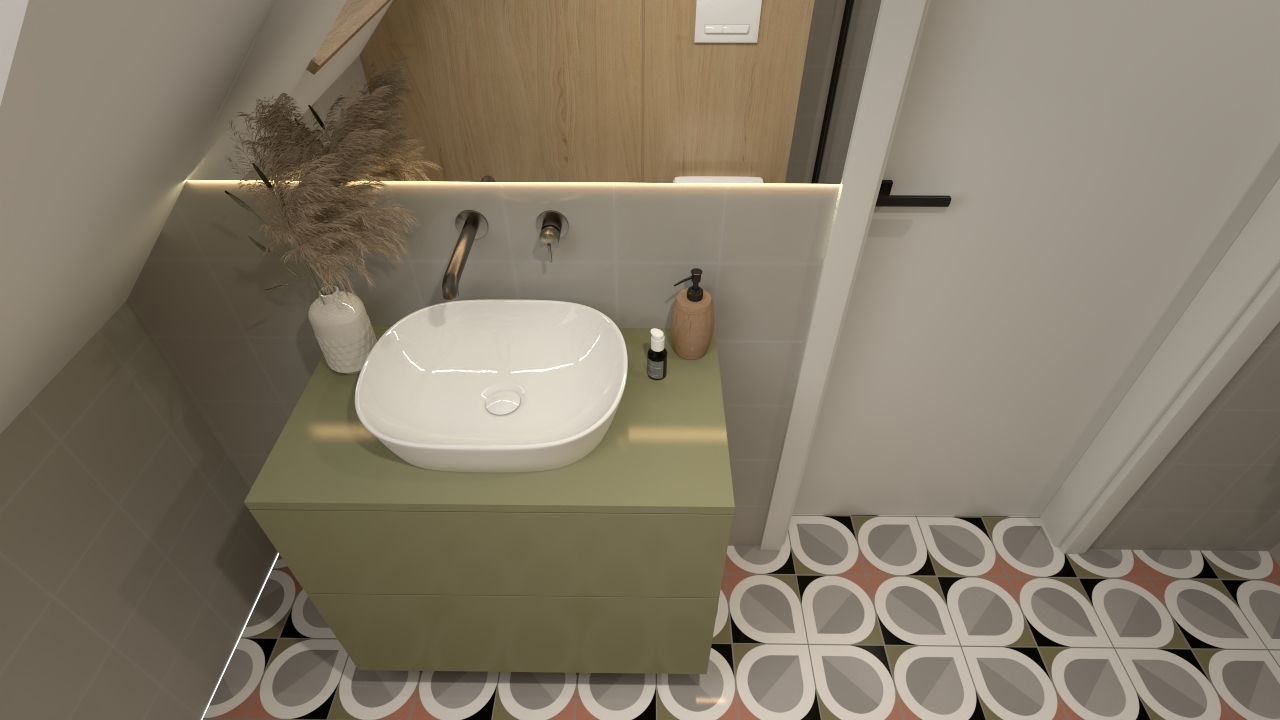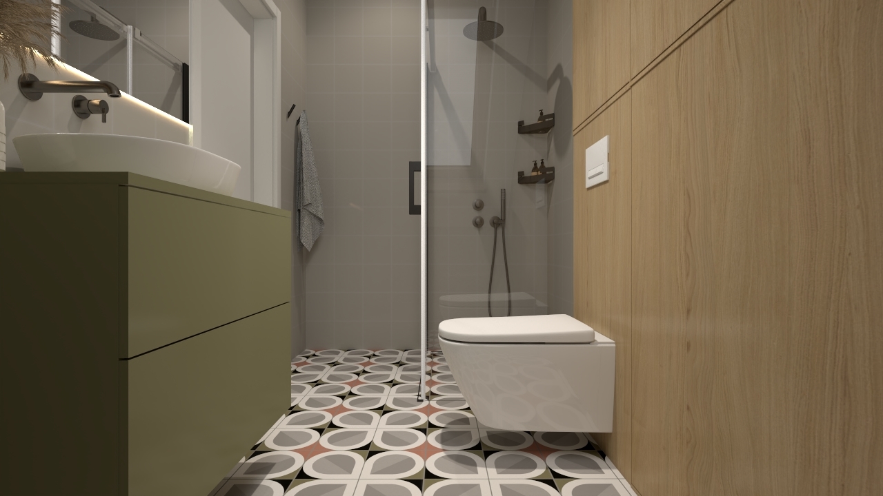 Projekt bazuje na kolekcji Bauhome od producenta Equipe, łącząc dekor Bauhome Blatt z bazą Bauhome Grau. Efekt? Łazienka pełna życia, ale jednocześnie zachowująca spójność i elegancję.