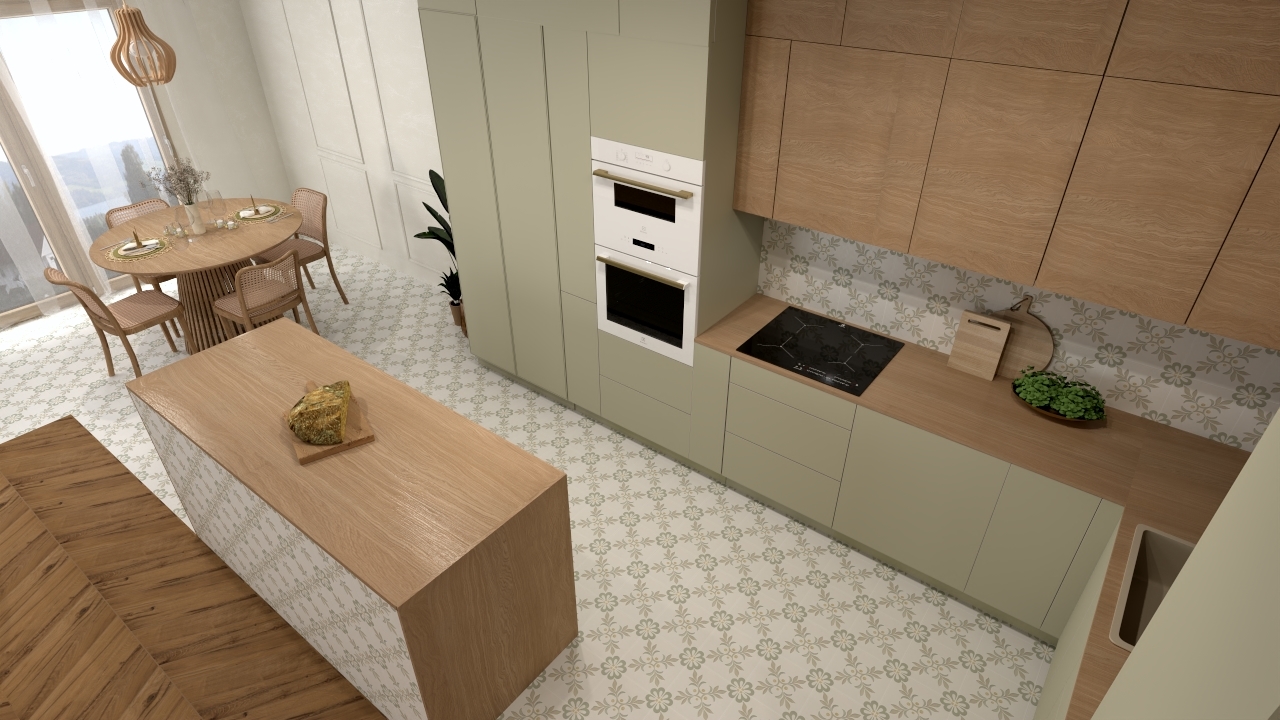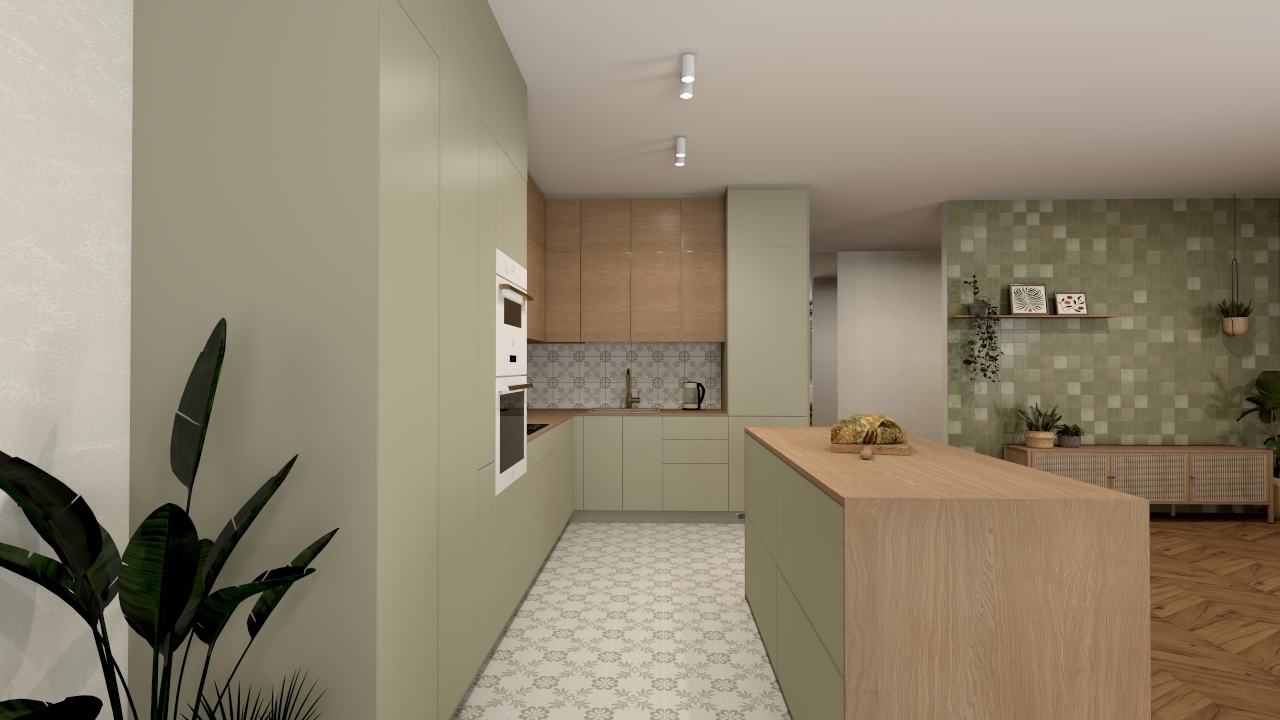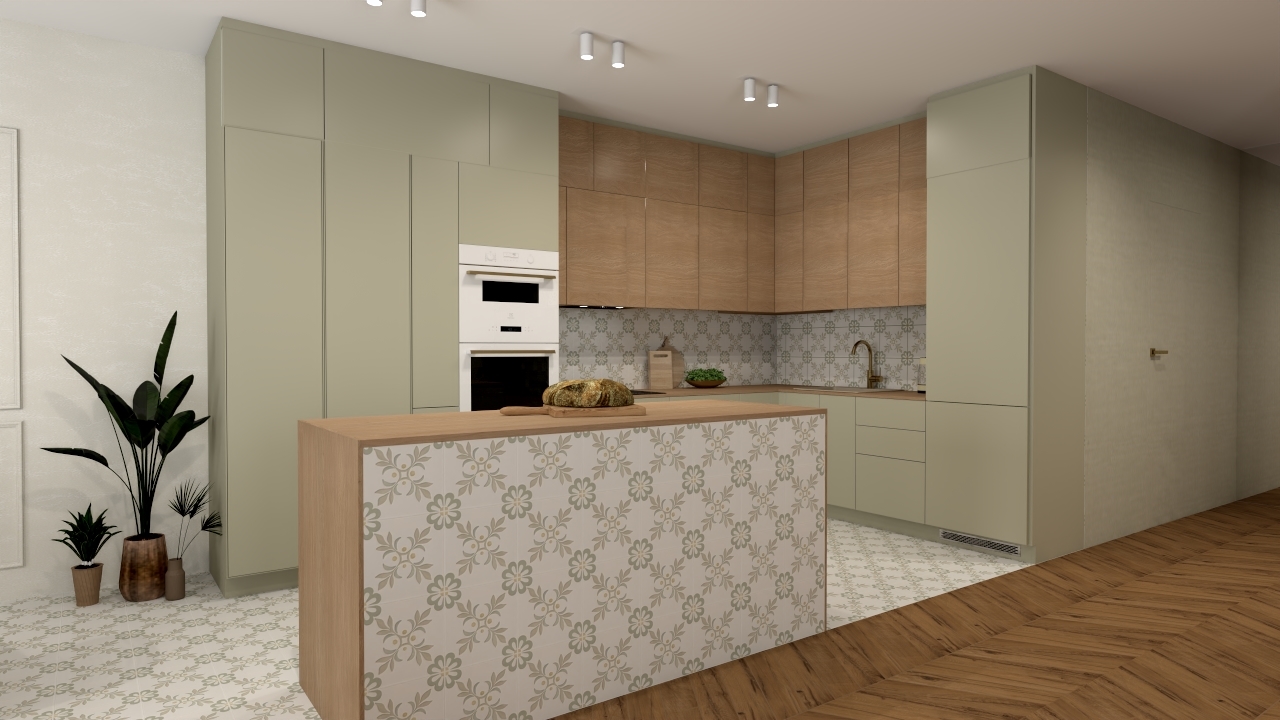 Wzór płytki Llevant Taupe został powtórzony na obudowie wyspy kuchennej oraz nad blatem kuchennym. To zabieg, który zapewnia spójność aranżacji i pozwala geometrycznemu dekorowi wybrzmieć jeszcze mocniej. Przeciwległa ściana, widoczna z części wypoczynkowej, została wykończona płytką Samira Sage w formacie 10,7×10,7 cm. Jej delikatnie zróżnicowana powierzchnia i przyjemny, zielony odcień nadają wnętrzu świeżości i wprowadzają subtelną grę światła. To akcent, który świetnie komponuje się z naturalnym drewnem na podłodze i roślinnymi dodatkami, budując atmosferę lekkości i relaksu.