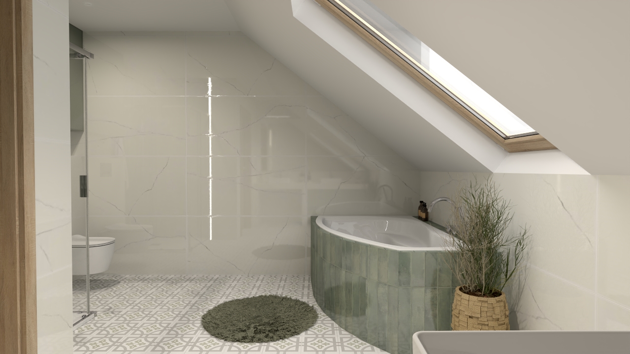 Ta łazienka zyskuje niepowtarzalny klimat dzięki zestawieniu 3 płytek – Vintage Saggio, Iceland Pulido oraz Frammenti Verde. Na posadzce zastosowano płytkę, która przywołuje klimat dawnych, cementowych kafli. Geometryczny, powtarzalny motyw w odcieniach szarości i delikatnej zieleni tworzy przyjemną rytmikę i dodaje wnętrzu lekkości. Wzór Vintage Saggio od Pamesy doskonale łączy się z naturalnym drewnem drzwi oraz zielonymi akcentami. Ściany zostały wykończone błyszczącymi płytkami Iceland Pulido od producenta Baldocer. Ich powierzchnia imituje marmur o delikatnym użyleniu i subtelnym połysku, który pięknie odbija światło, optycznie powiększając pomieszczenie. Strefa wanny oraz prysznica została wyróżniona płytką Frammenti Verde Acqua Brick od włoskiego producenta Delconca – to podłużne kafle o głębokim, zielonym odcieniu i nieregularnej, szkliwionej powierzchni. Zestawienie trzech tak różnych płytek tworzy harmonijną, zrównoważoną kompozycję, w której każda przestrzeń ma swój własny rytm.