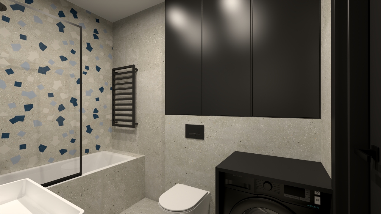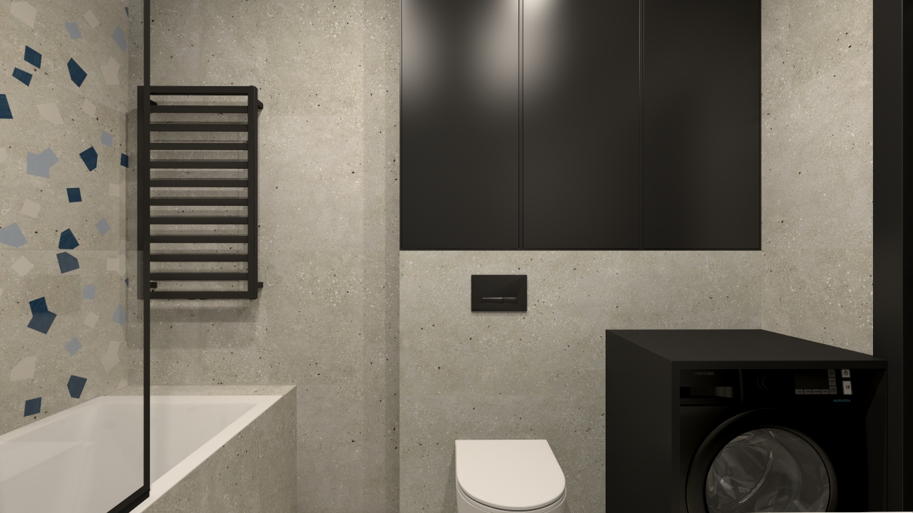 W tej łazience postawiłam na połączenie surowości betonu z odważnym, kolorystycznym akcentem. Neutralna baza z płytek Ape Ama Grigio 60×120 i Ape Ama Ricetta Grigio 60×120 tworzy spokojne, nowoczesne tło, które nadaje wnętrzu industrialnego charakteru.