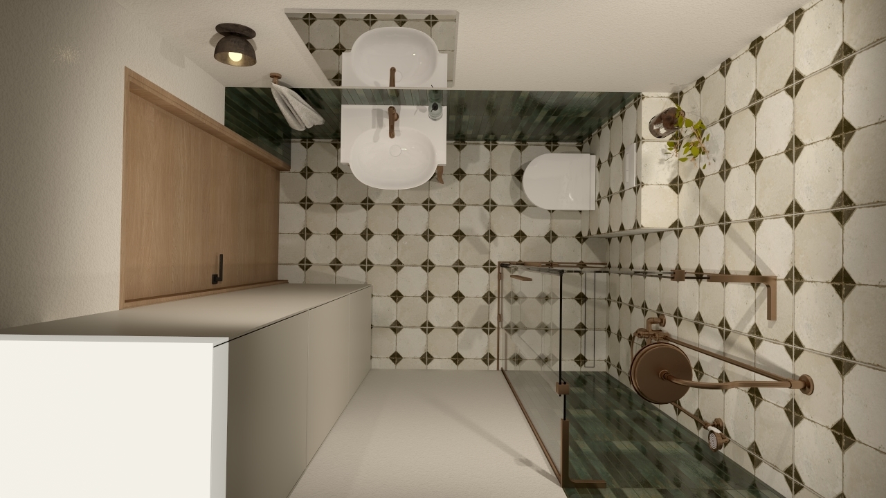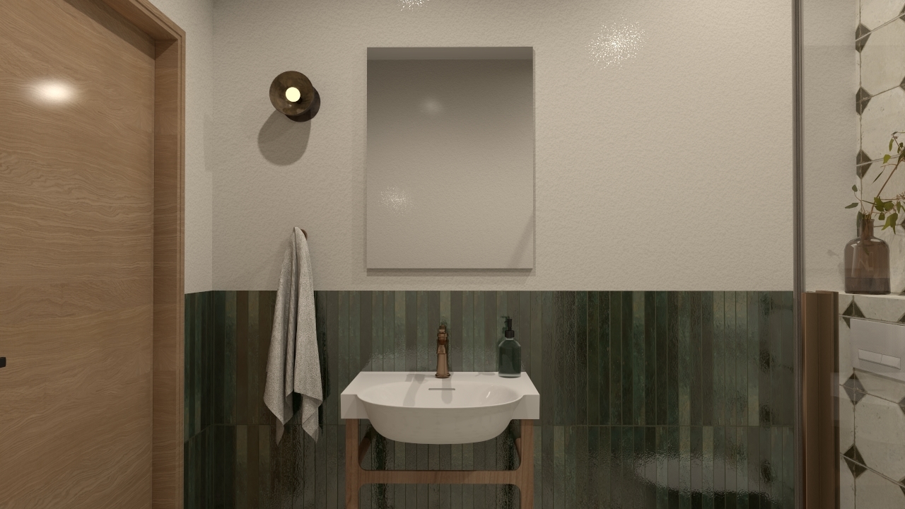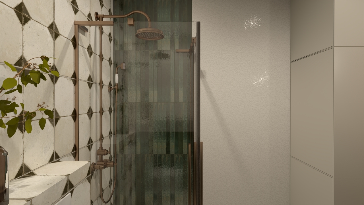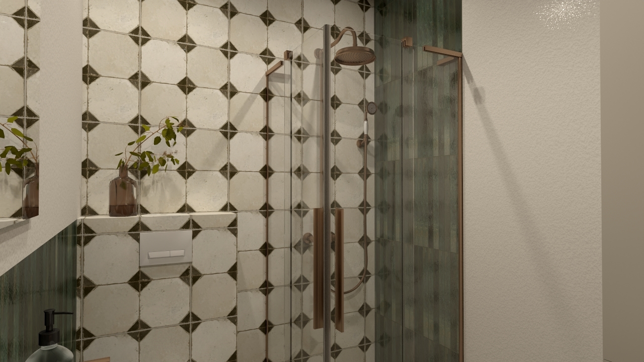Zestawienie dwóch wyrazistych kolekcji – FS Yard Black oraz Bali Isle of Pines. Każdy detal został tu przemyślany tak, by podkreślić zarówno klasyczną elegancję, jak i naturalne, ciepłe akcenty. Dominującym elementem wystroju są płytki FS Yard Black, których delikatnie postarzany wzór łączy w sobie beżową bazę z geometrycznym rytmem czarnych akcentów. Ich lekko rustykalna powierzchnia nawiązuje do tradycyjnych, rzemieślniczych kafli, a jednocześnie zachowuje ponadczasową elegancję. Zupełnie inny klimat wprowadza Bali Isle of Pines – podłużna płytka o głębokiej, zielonej barwie, z wyraźnym, nieregularnym szkliwem. Jej powierzchnia odbija światło w zróżnicowany sposób, co sprawia, że pięknie kontrastuje z geometrycznym porządkiem FS Yard Black.