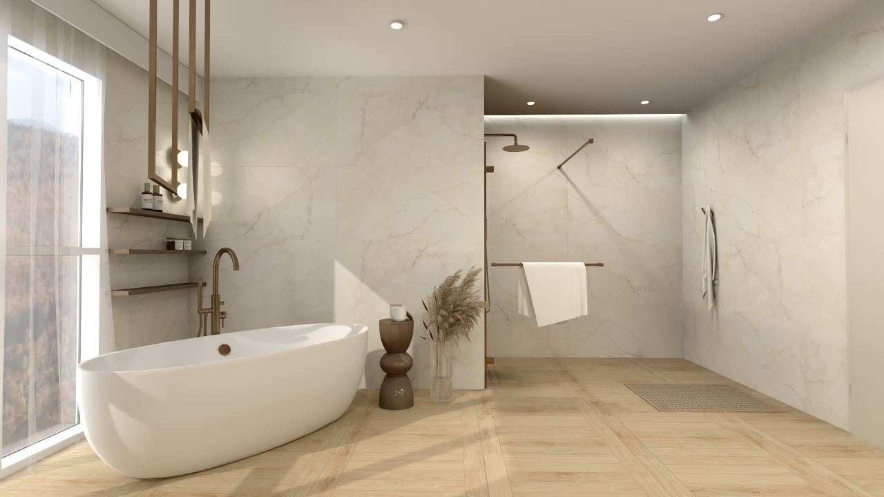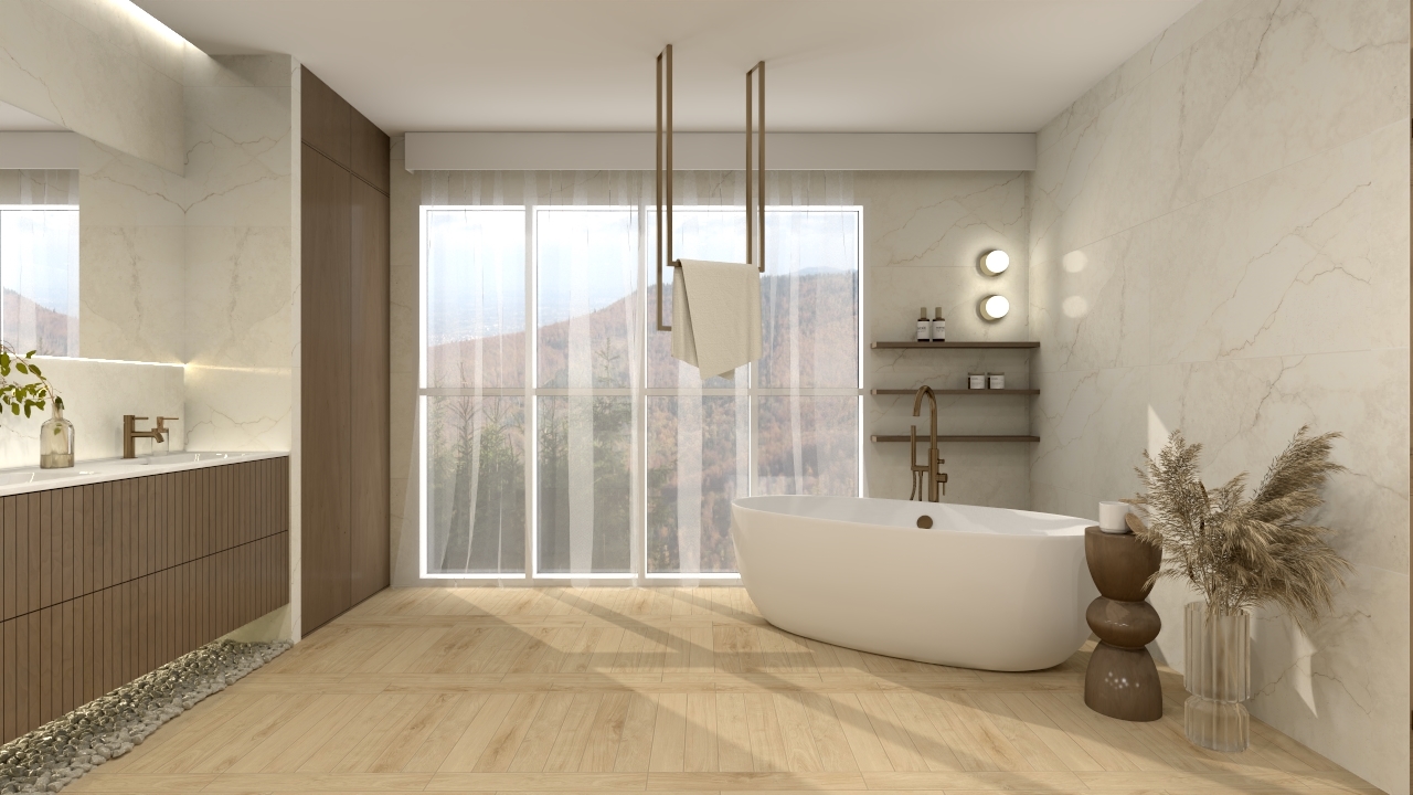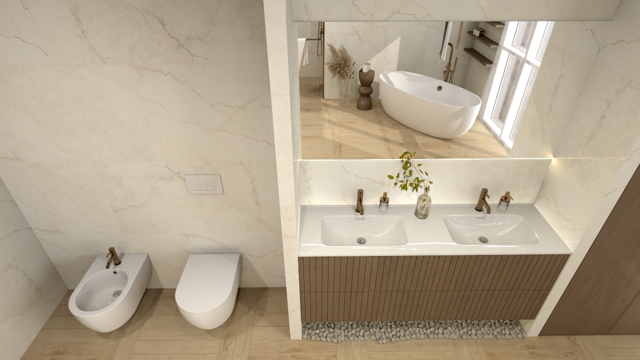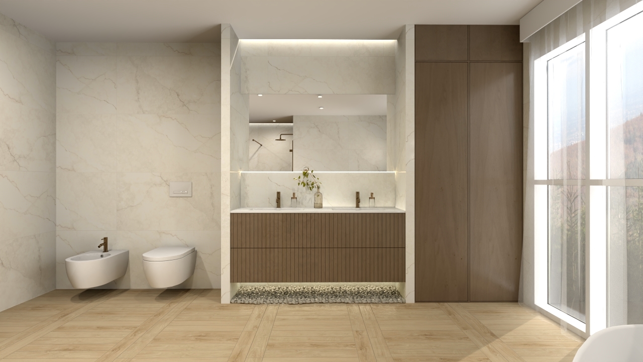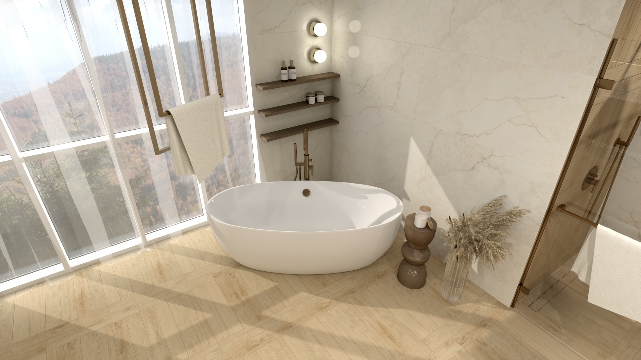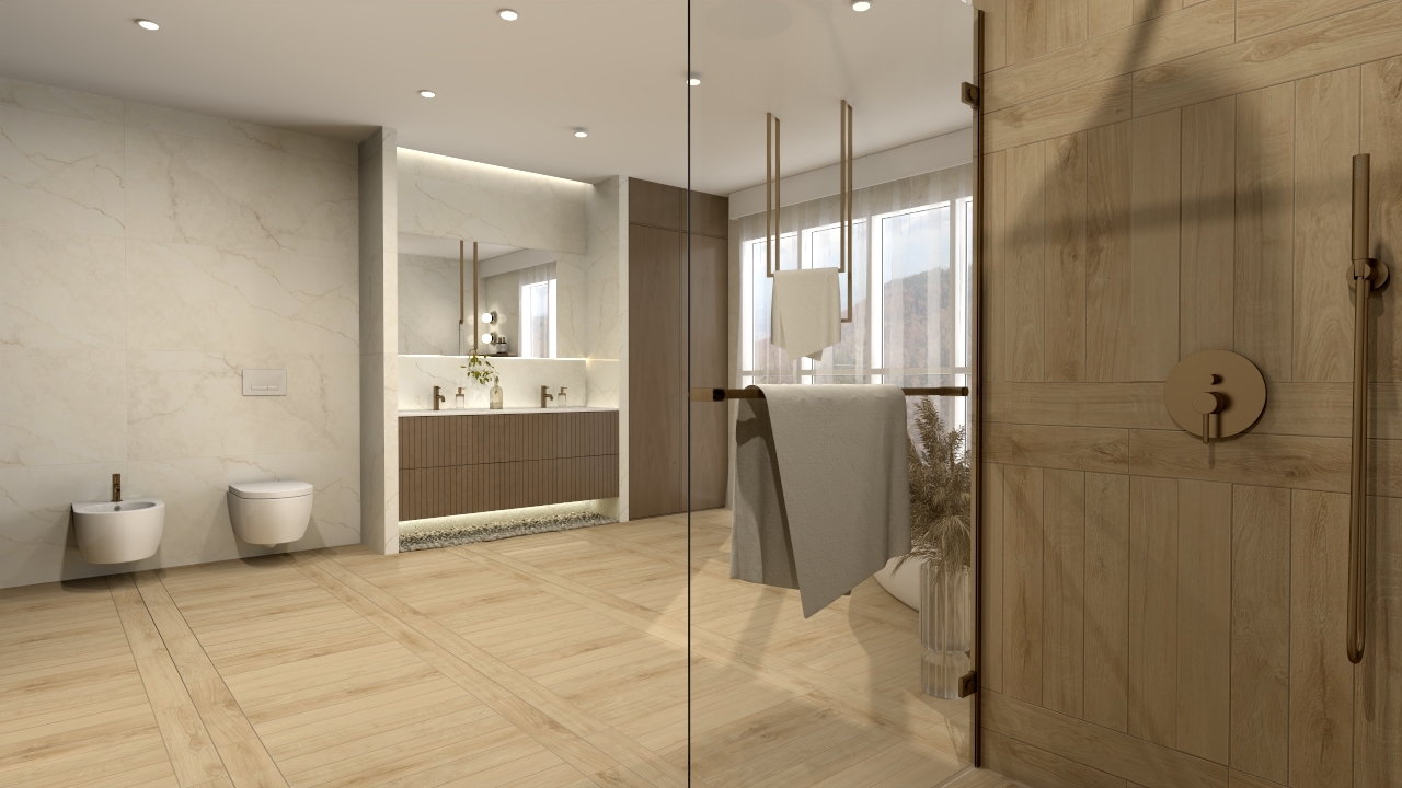 ciepło drewna Michigan Oak zestawione z kamiennym Alabastrino Marfil daje efekt harmonii i naturalnego wnętrza. Marmurowa faktura ścian dodaje blasku, a drewniany rysunek posadzki wprowadza naturalne ciepło. Ściany zostały wykończone płytkami Alabastrino Marfil Silk 3D, które wnoszą do wnętrza nutę wyrafinowania i lekkości. Ich powierzchnia jest delikatnie błyszcząca, co pięknie odbija światło, tworząc subtelną grę refleksów. Największym atutem tych płytek są precyzyjnie opracowane żyłki w formie rzeźbionych, miękkich wgłębień, efekt ten sprawia, że wnętrze nie jest płaskie, lecz pełne naturalnych przejść i niuansów. Na posadzce zastosowano płytki drewnopodobne Michigan Oak, które perfekcyjnie imitują naturalne drewno w ciepłym, miodowym odcieniu. Subtelne usłojenie i miękki półmat nadają wnętrzu przytulności, a jednocześnie zachowują elegancki charakter. Drewno wprowadza równowagę wobec chłodnej tafli płytek kamiennych, tworząc spójną całość.