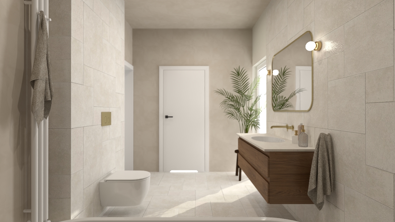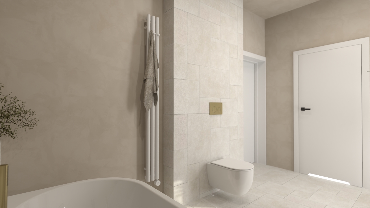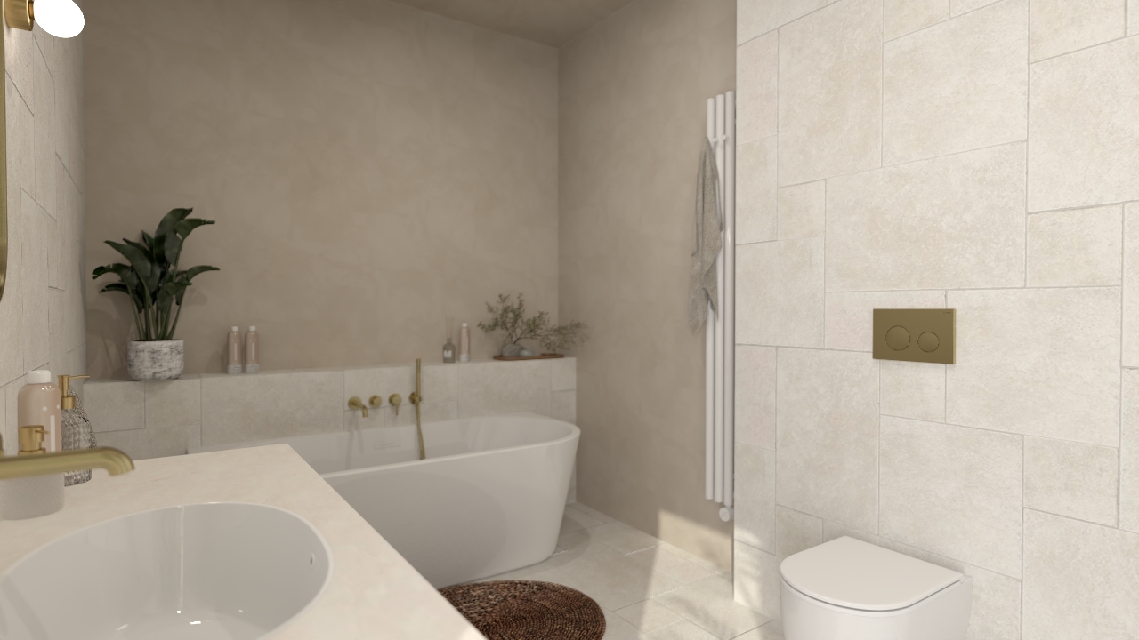 To przestrzeń, w której dominują spokój i harmonia. Stonowana kolorystyka i subtelna gra faktur tworzą tło dla złotych detali armatury i naturalnych dodatków, takich jak rośliny czy pleciony dywanik. Całość jest przytulna, ale wciąż nowoczesna – idealna dla osób, które szukają równowagi między elegancją a prostotą.