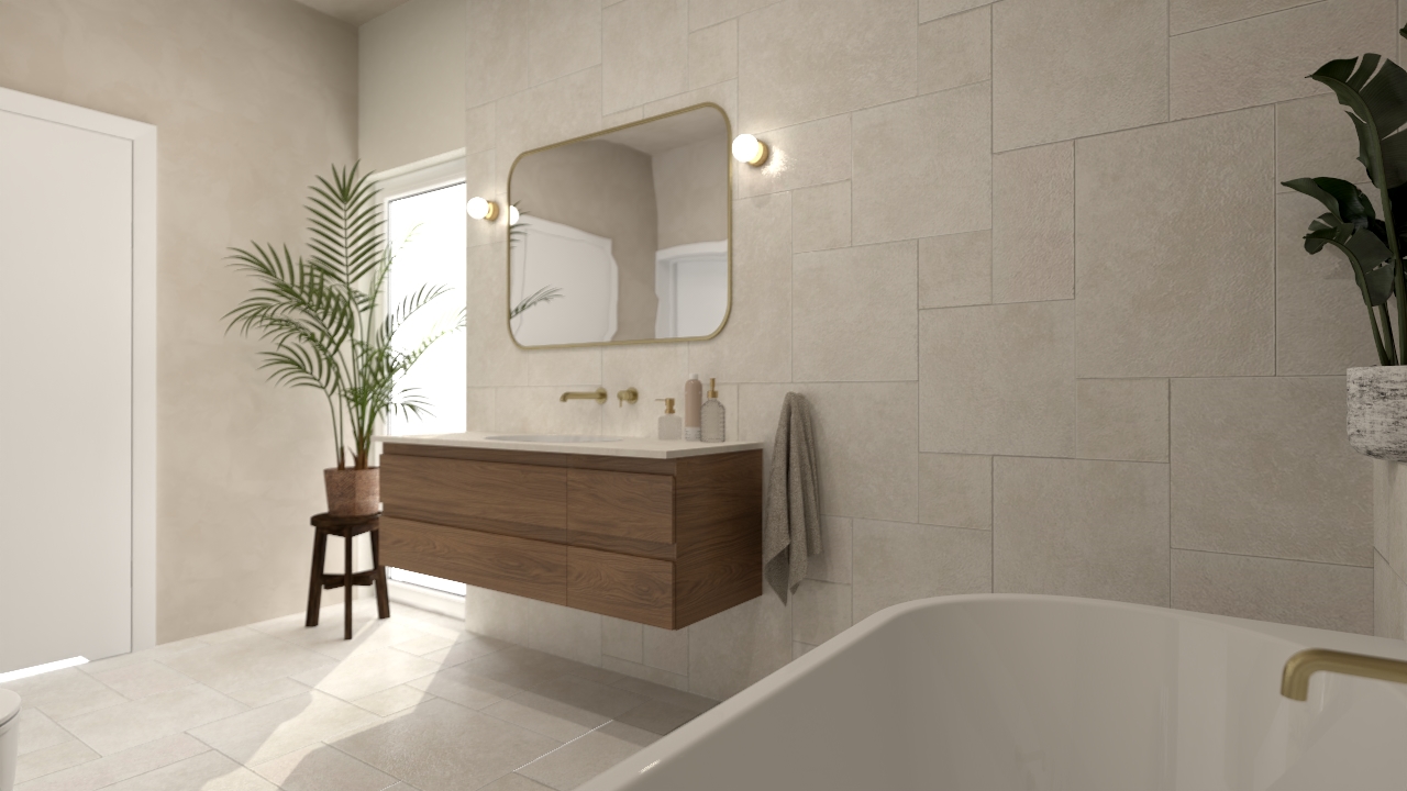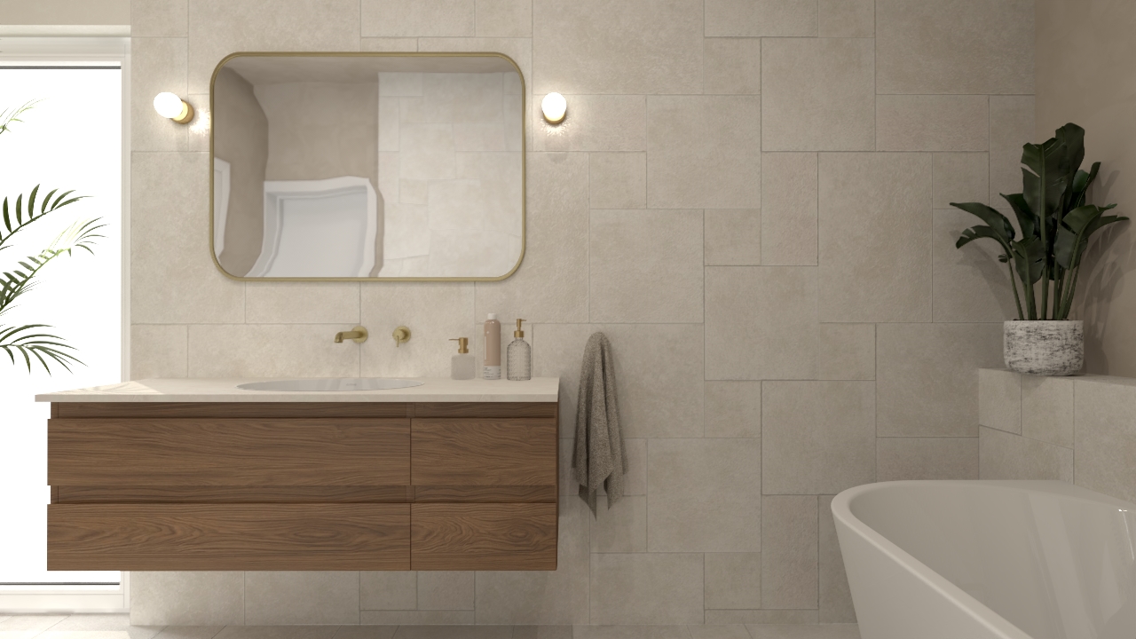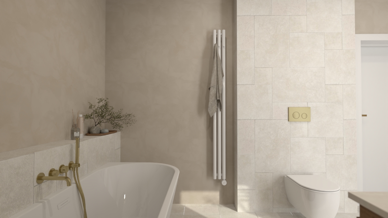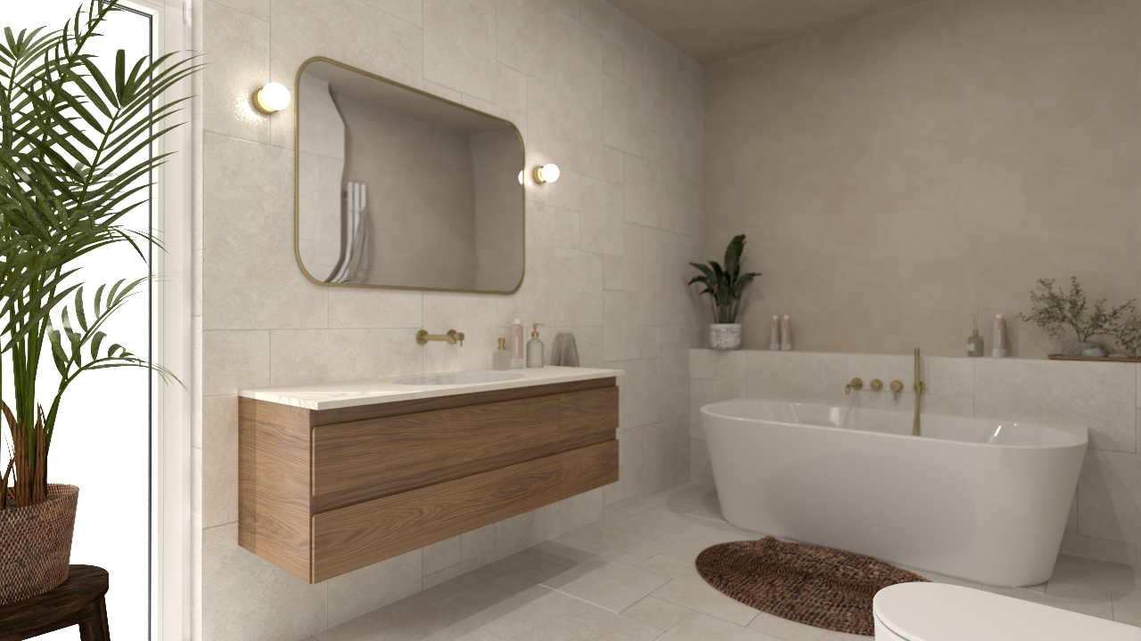 To przestrzeń, w której dominują spokój i harmonia. Stonowana kolorystyka i subtelna gra faktur tworzą tło dla złotych detali armatury i naturalnych dodatków, takich jak rośliny czy pleciony dywanik. Całość jest przytulna, ale wciąż nowoczesna – idealna dla osób, które szukają równowagi między elegancją a prostotą.