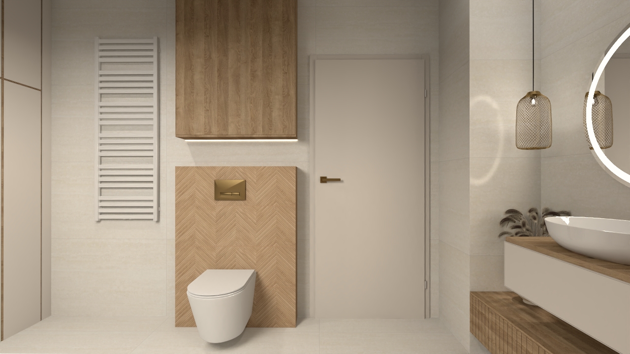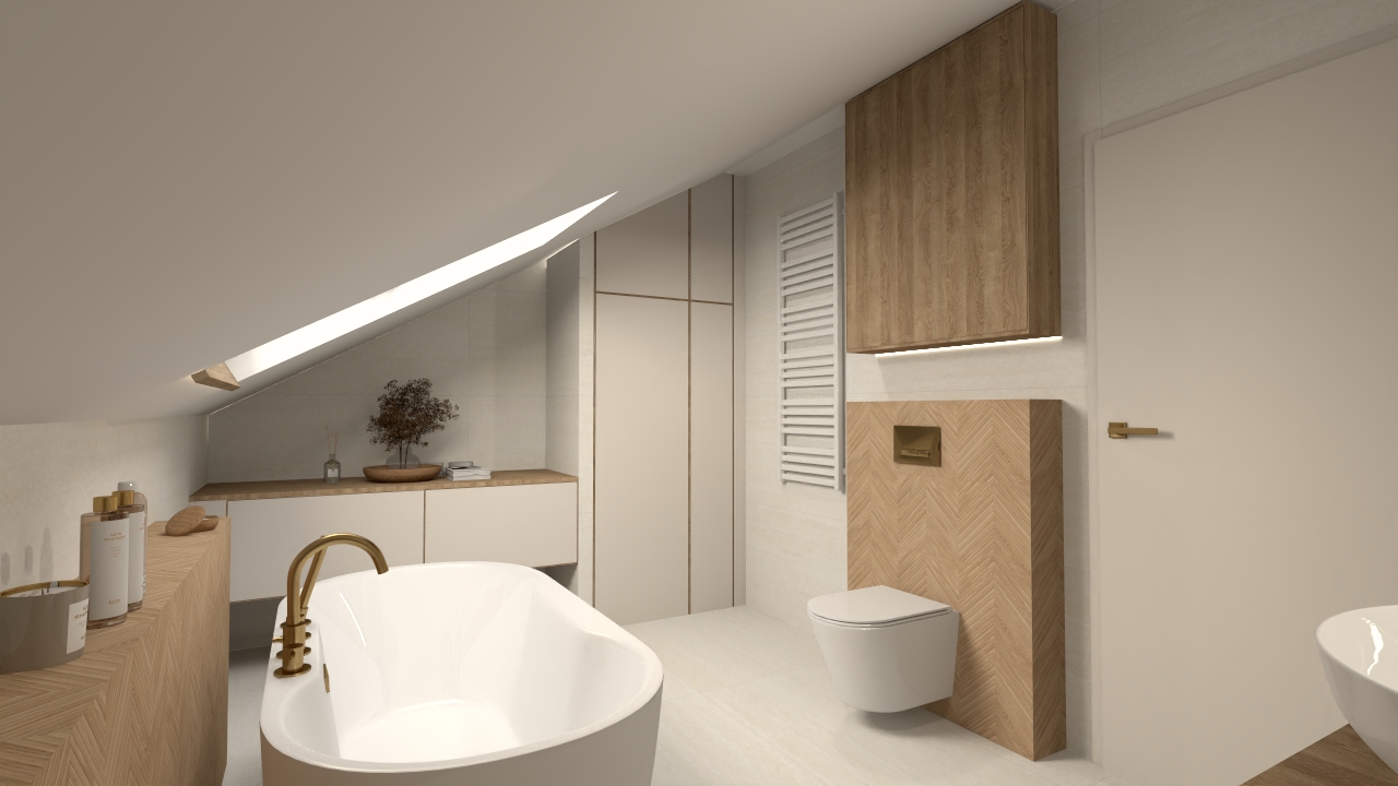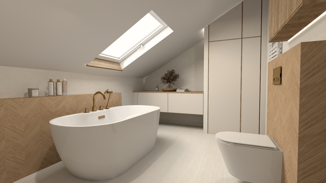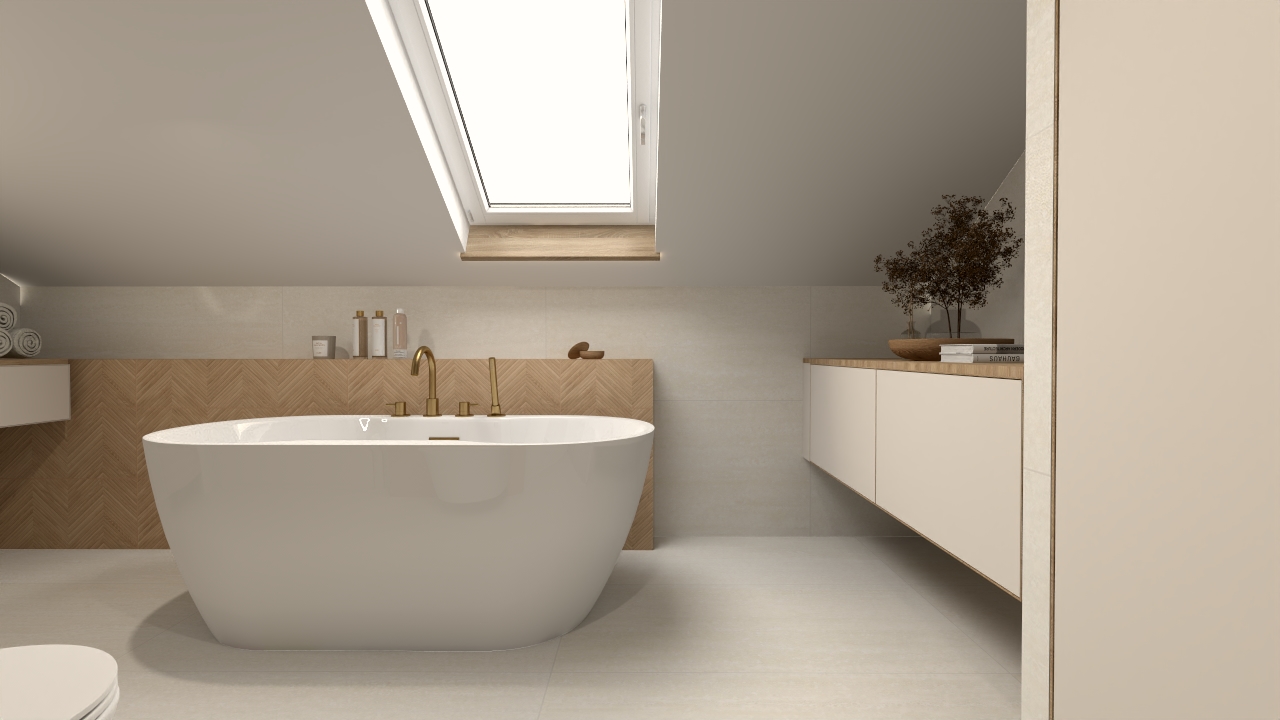Płytki imitujące trawertyn Ascoli White stanowią jasną, neutralną i luksusową bazę dla całej aranżacji. Charakteryzują się bardzo jasnym, kremowo-beżowym odcieniem, który idealnie odbija naturalne światło wpadające przez okno dachowe, optycznie powiększając przestrzeń. Ich powierzchnia wiernie oddaje delikatne żyłkowanie i subtelną porowatość, typowe dla trawertynu. wypukły dekor Larchwood Zig wprowadza do łazienki dynamiczny wzór i ciepłą, naturalną teksturę, stanowiąc doskonały kontrast dla jasnej bazy. Płytki te układają się w modny wzór jodełki, a ich trójwymiarowa, wypukła faktura dodaje głębi i jest przyjemna dla oka. Całość tworzy wnętrze, które jest nie tylko funkcjonalne, ale przede wszystkim eleganckie, ciepłe i relaksujące