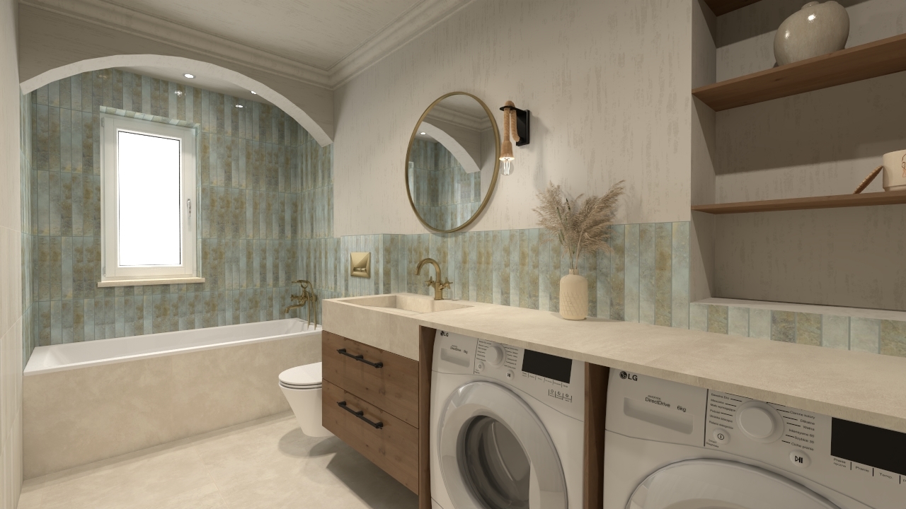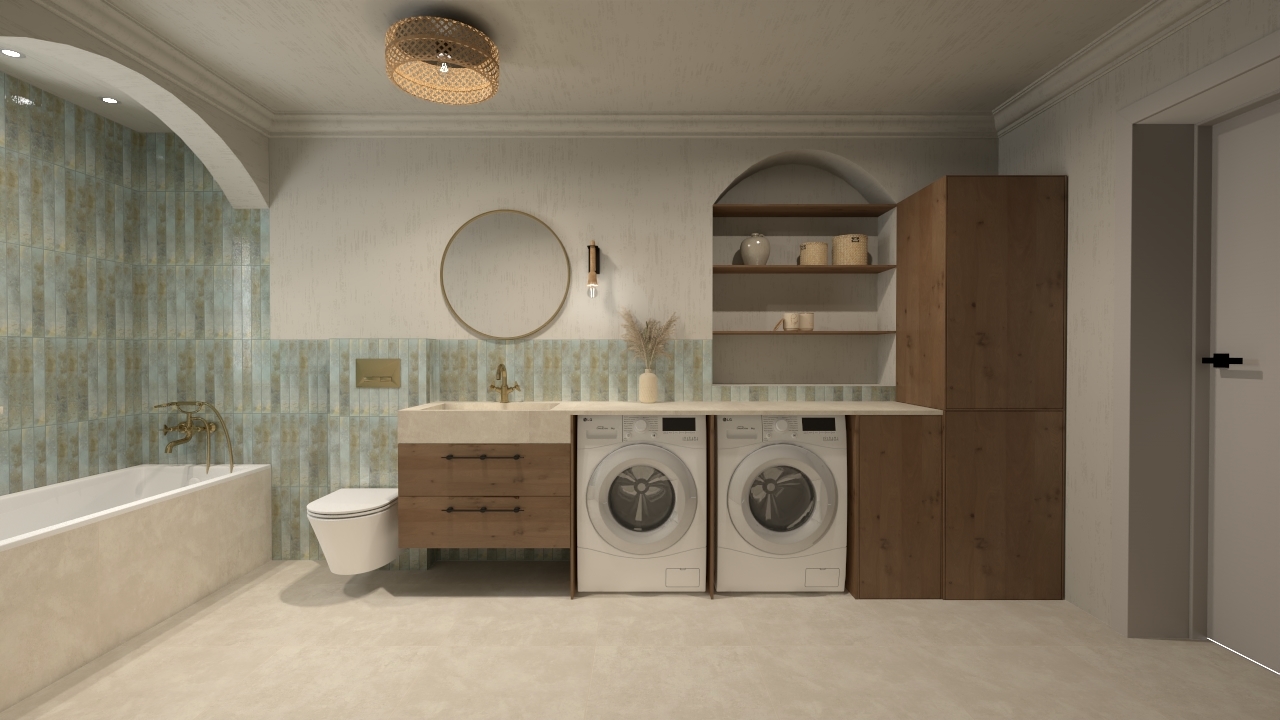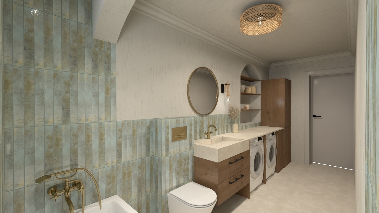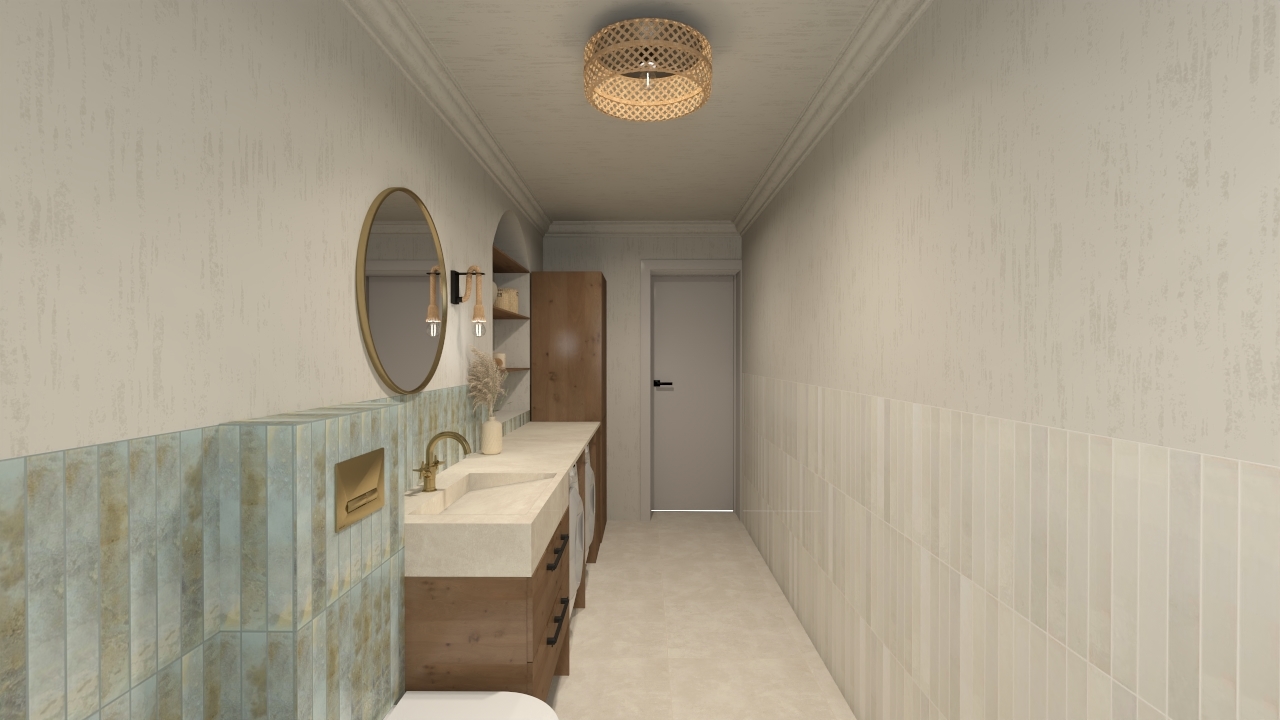 Nietypowa łazienka o delikatnie egzotycznym charakterze, osiągniętym dzięki płytkom Bali oraz Parker Ivory. Płytka Parker Ivory pełni rolę nowoczesnej bazy, która wprowadza subtelny industrialny akcent, jednocześnie rozjaśniając przestrzeń. Płytka ta imituje delikatny, jasny beton w odcieniu kości słoniowej, jej tekstura jest matowa i jednolita, z bardzo subtelnym, ledwo widocznym „przetarciem”.