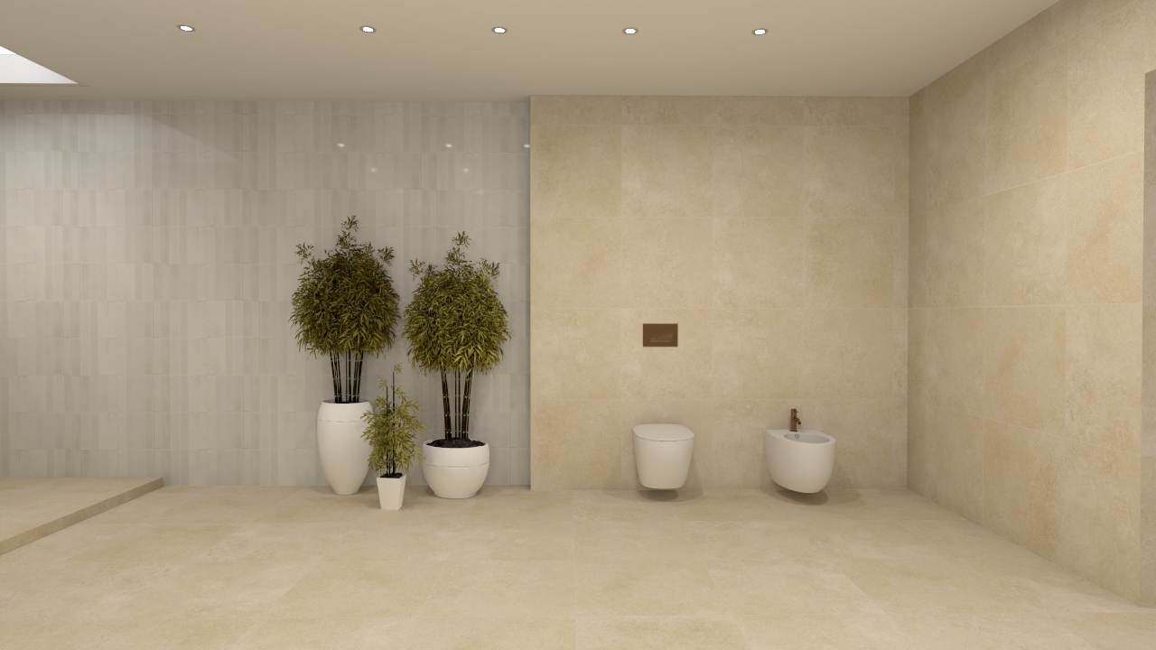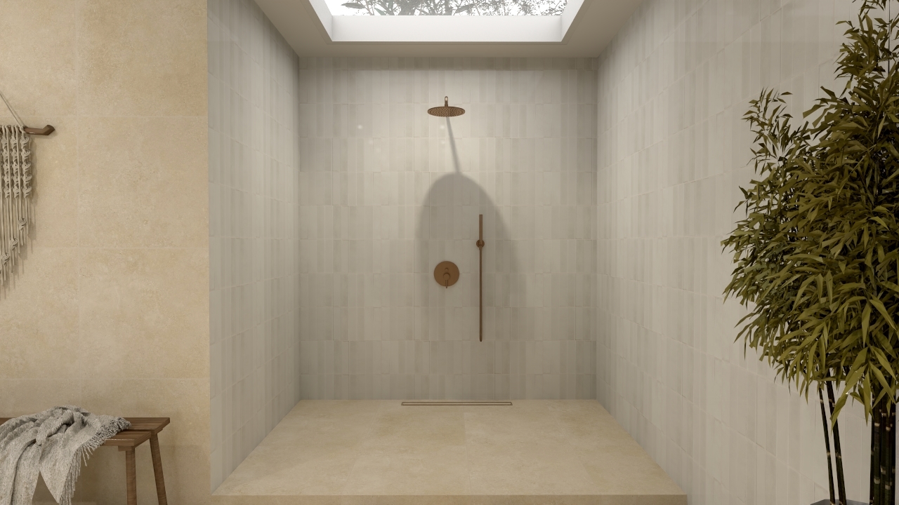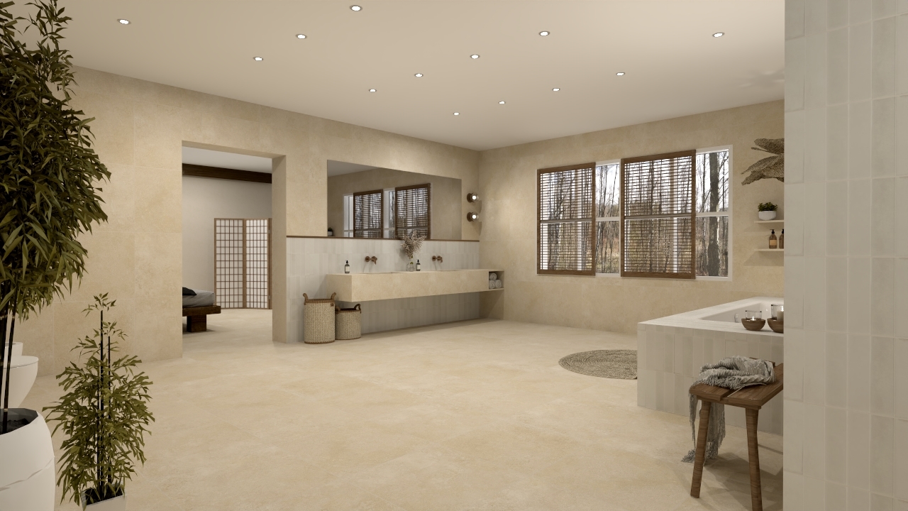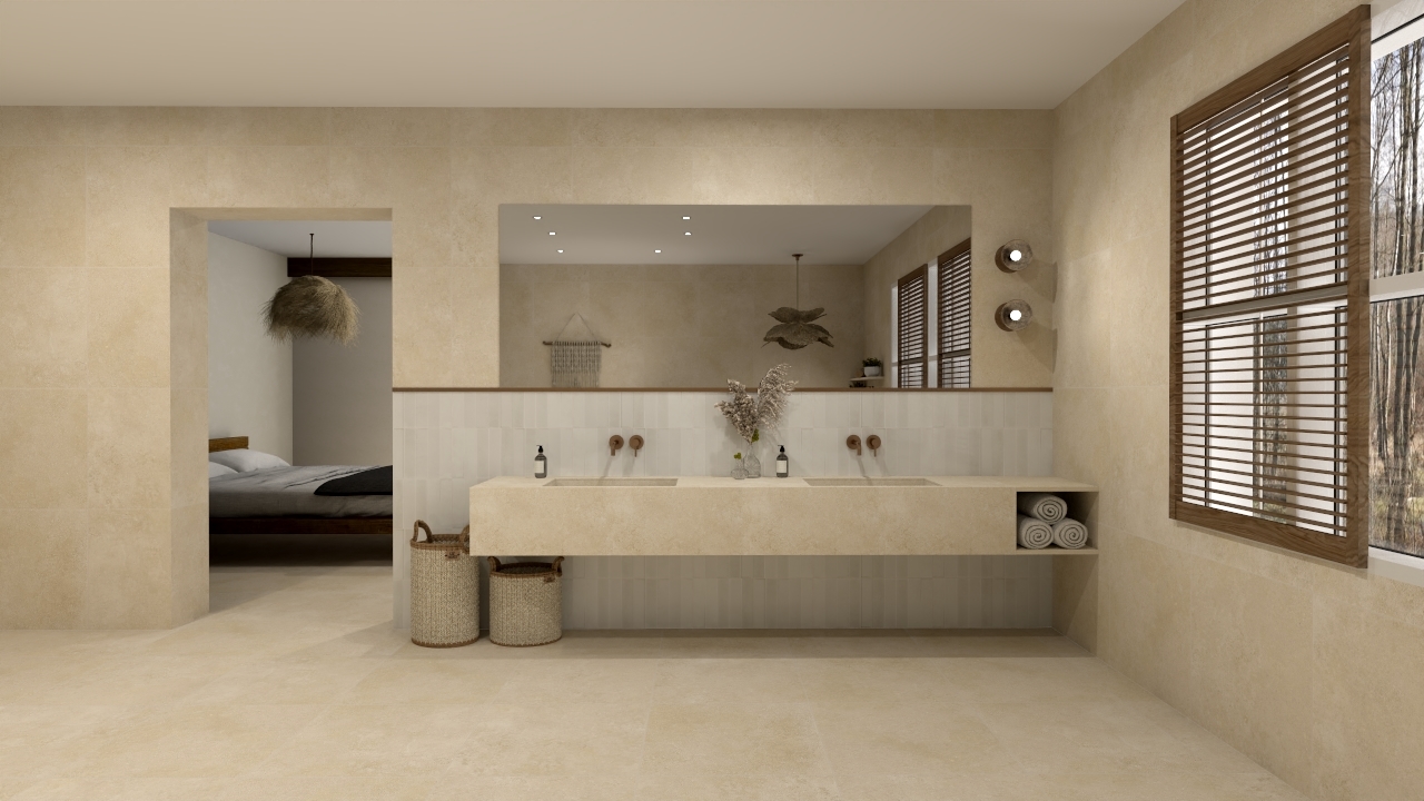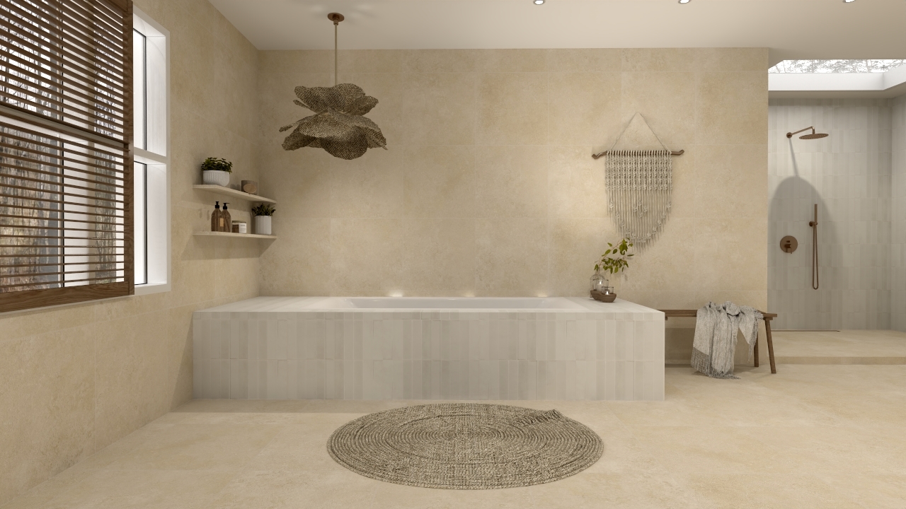 W tym przestronnym salonie kąpielowym piaskowa płytka Nereidi Ecru spotyka chłodną biel Art Nouveau Bianco. Połączenie to tworzy atmosferę spokoju, luksusu i naturalnego ciepła, typową dla stylu boho z eleganckimi, monolitycznymi akcentami. Płytki Nereidi Ecru stanowią ciepłą i spójną bazę, która jest esencją stylu boho-minimalistycznego, wykorzystana została jako materiał na całej posadzce oraz większości ścian w salonie kąpielowym. Delikatna imitacja kamienia o bardzo ciepłym, piaskowo-beżowym odcieniu przełamana zostaje jasną płytką o chłodniejszym odcieniu – Art Nouveau Bianco. Płytki te, mimo początkowego wrażenia „cegiełek”, są formatem 25×60 cm podzielonym na mniejsze segmenty. Ich błyszczące wykończenie oraz delikatnie nierówna powierzchnia dodają wnętrzu świeżości i nowoczesności. W efekcie powstała przestrzeń, która łączy luksus dużej łazienki z relaksującym, naturalnym i przytulnym klimatem stylu boho.