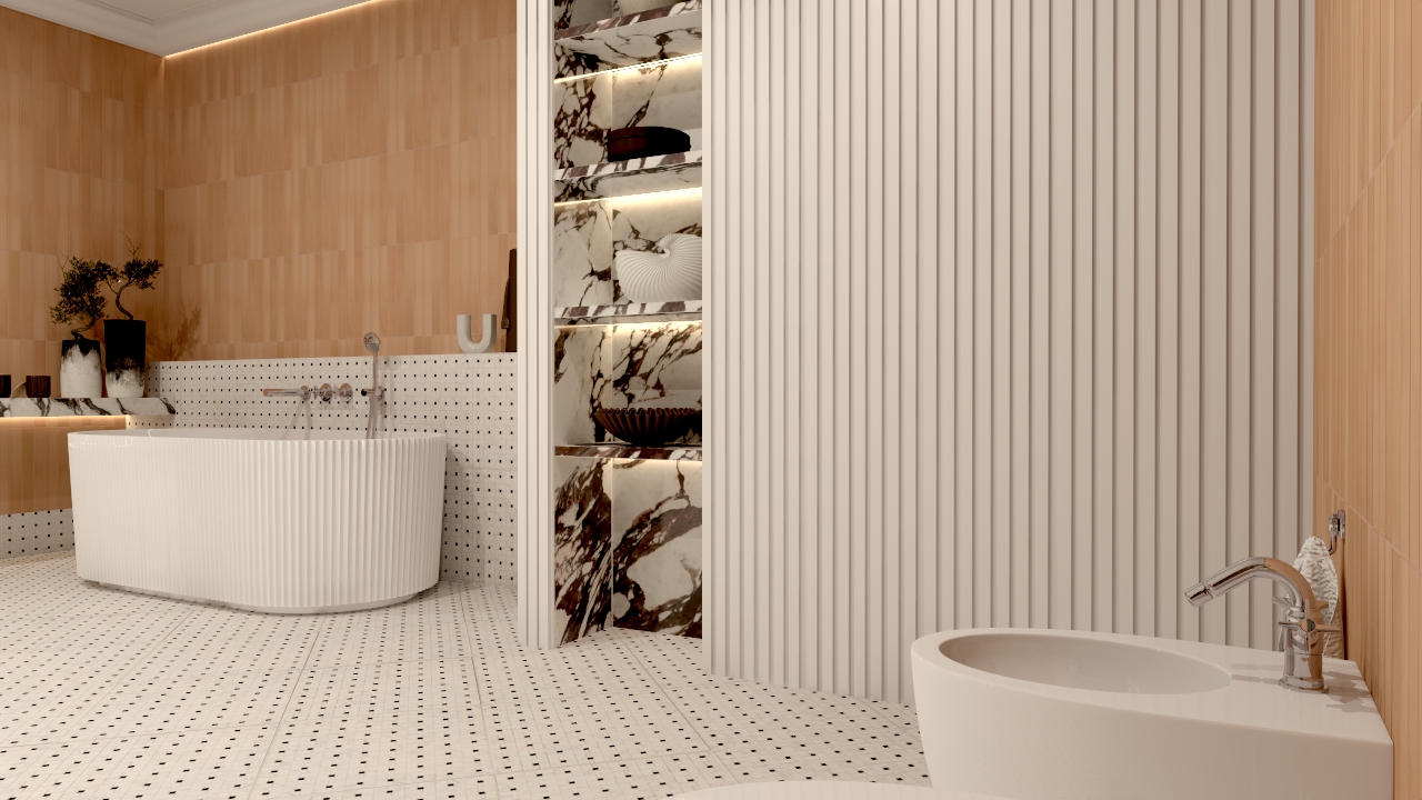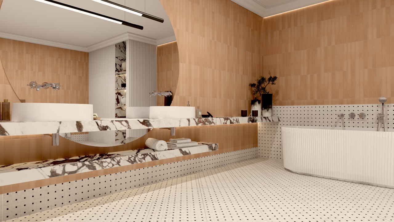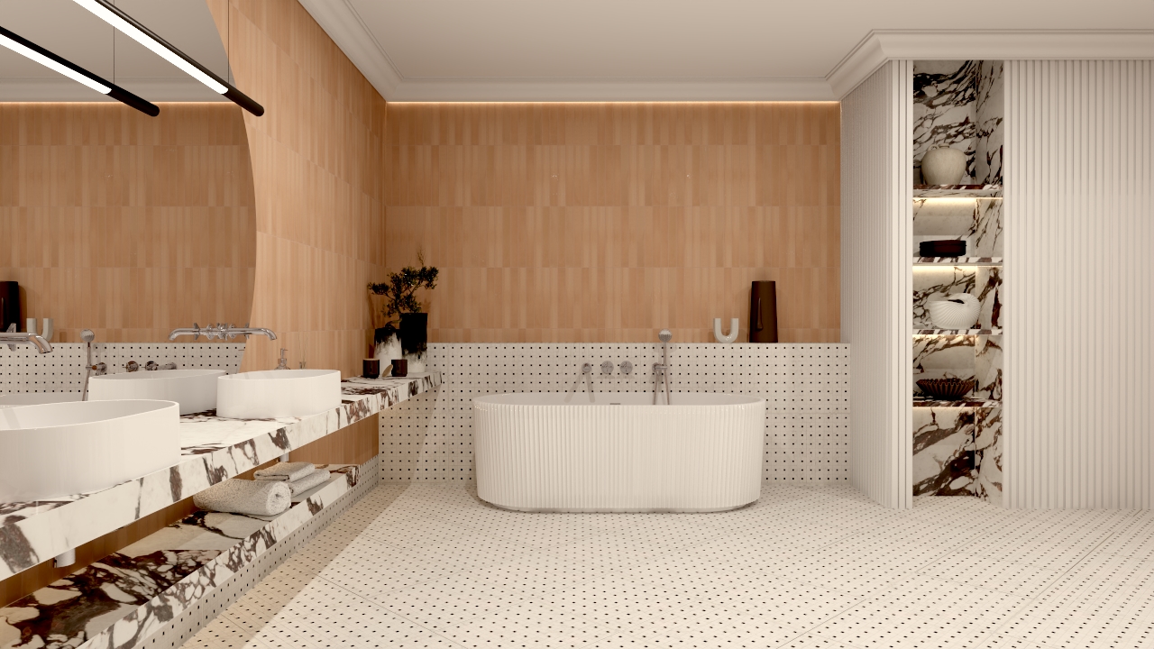 W tym projekcie salonu kąpielowego chciałam stworzyć przestrzeń, która będzie balansować między elegancją klasycznych łazienek a miękką, niemal śródziemnomorską atmosferą relaksu. Kluczową rolę odegrały tu trzy materiały, które – choć bardzo różne – razem budują spójną i wyjątkowo zmysłową kompozycję.