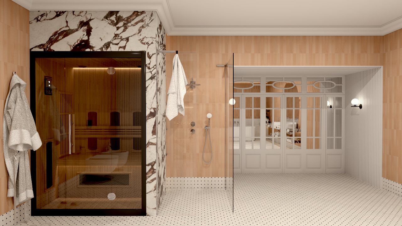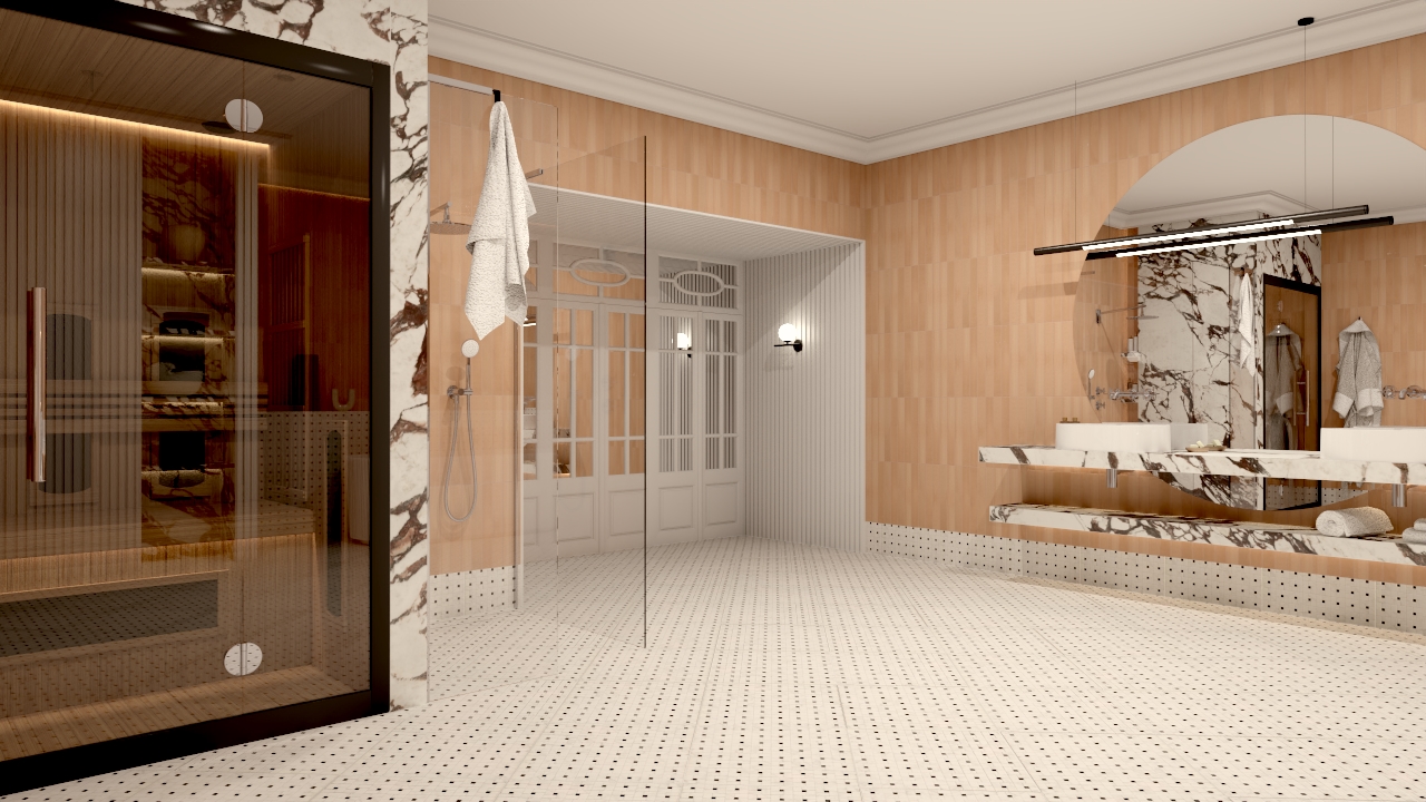 Akcentem podkreślającym luksusowy charakter przestrzeni jest kamień w wydaniu Ape Medicea Marble. Użyłam go w kluczowych punktach – przy strefie sauny, na blatach oraz w detalach – aby wprowadzić kontrast, głębię i elegancję inspirowaną klasycznymi wnętrzami.