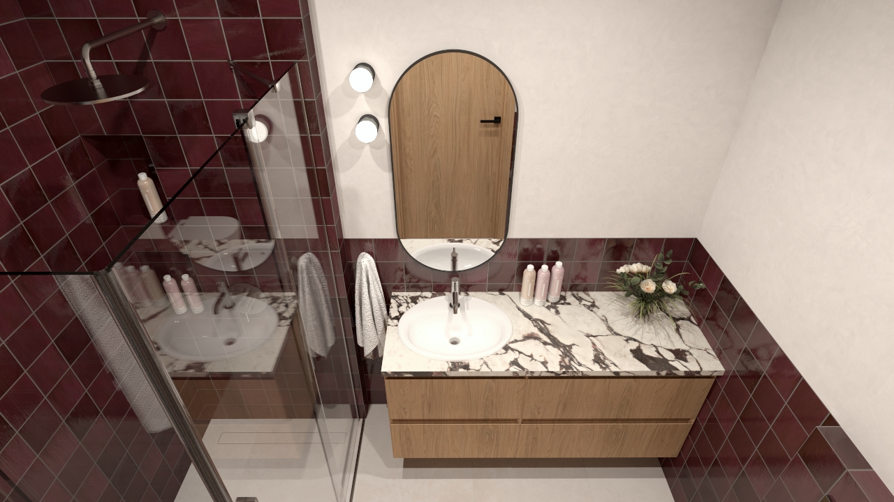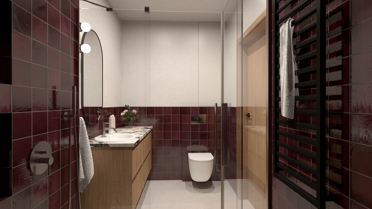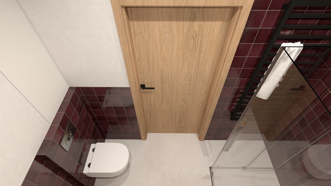 Zależało mi na stworzeniu przestrzeni, która będzie jednocześnie przytulna i wyrafinowana. Dlatego intensywny kolor pojawia się w strefach funkcjonalnych – pod prysznicem oraz przy zabudowie WC – tworząc wyraźne ramy kompozycyjne. Jasne płaszczyzny ścian otwierają wnętrze optycznie, a ciepłe drewno blatu dodaje mu naturalności i miękkości.