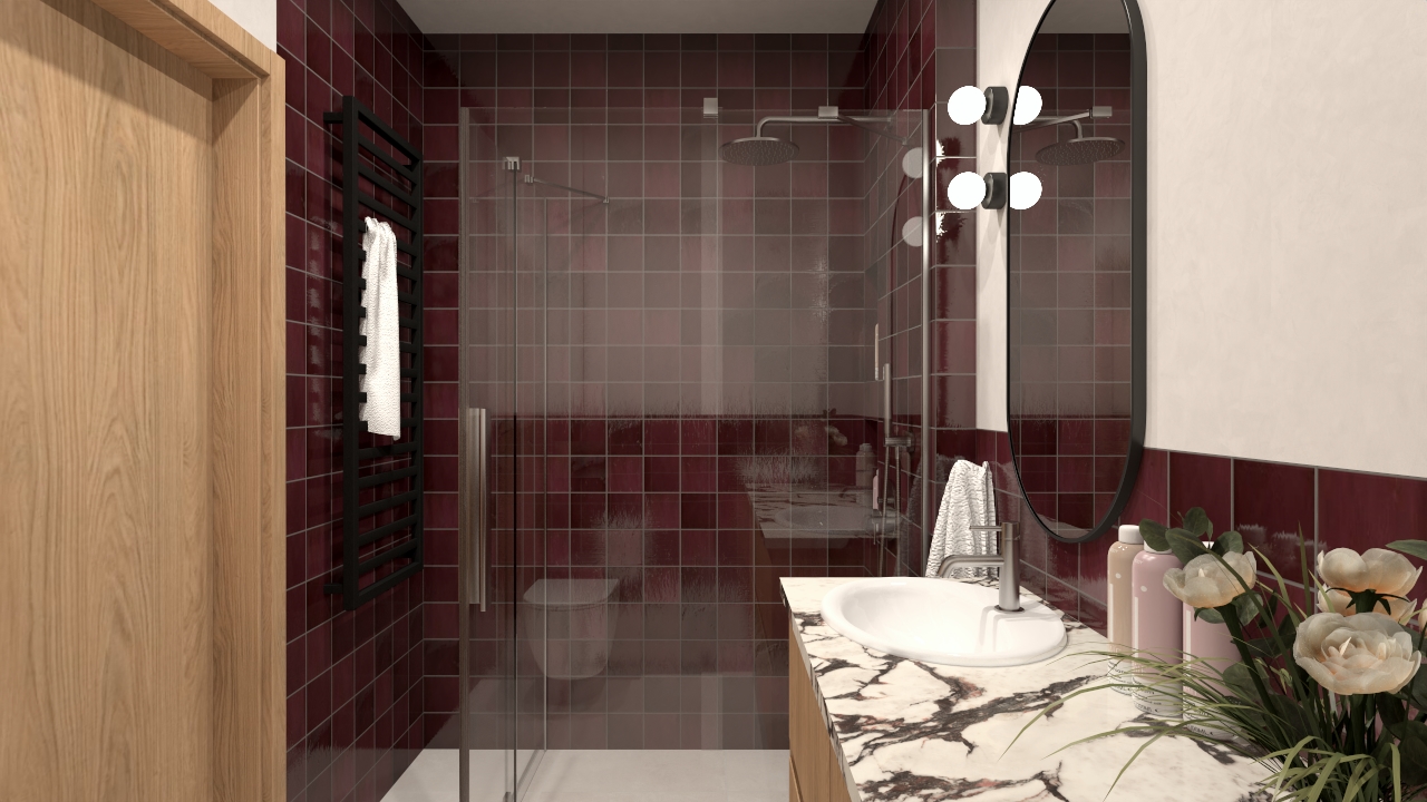W tej łazience postawiłam na odważne, ale bardzo spójne zestawienie kolorystyczne, w którym główną rolę gra głęboki odcień aubergine. Płytki Equipe Village Aubergine 13,2×13,2 wprowadzają do wnętrza wyjątkową, lekko połyskującą fakturę i budują jego charakter – są intensywne, eleganckie i niezwykle nastrojowe. Zestawiłam je z wielkoformatowymi płytami EnergieKer Parker White 60×120, które równoważą całość swoją spokojną, jasną powierzchnią i subtelną strukturą.