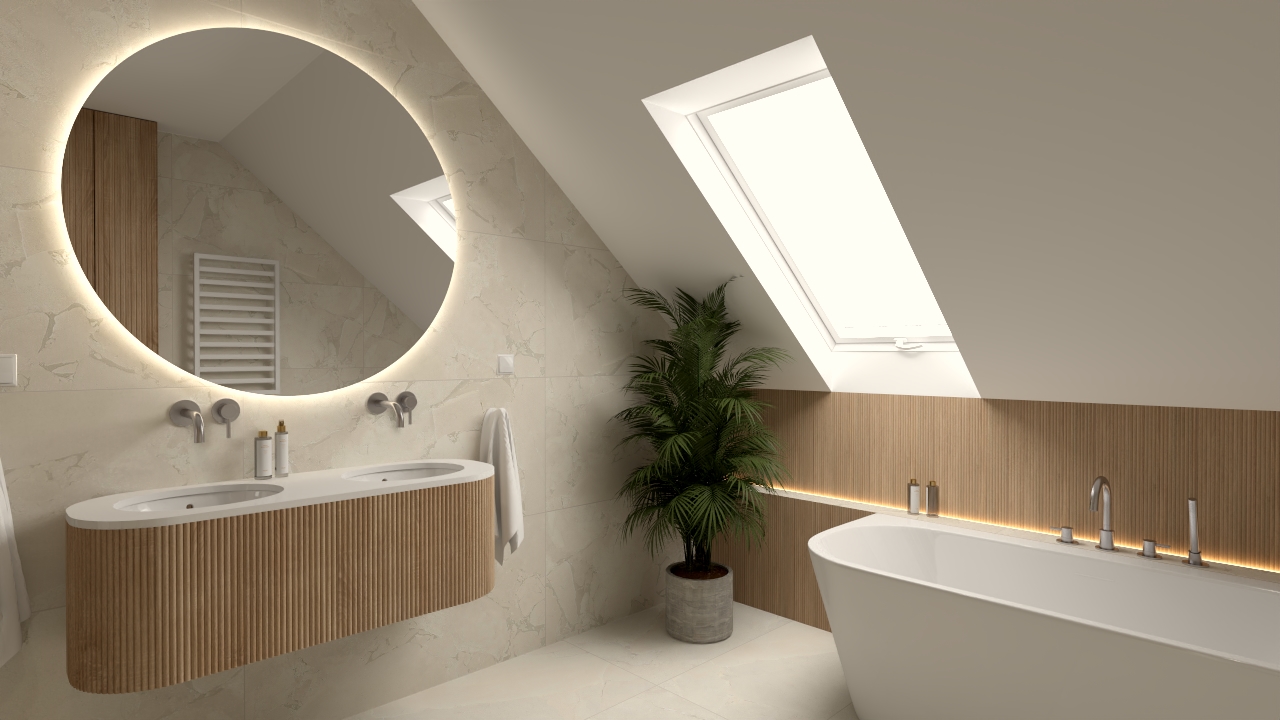 Łazienka na poddaszu z płytkami Bali i Marmorea